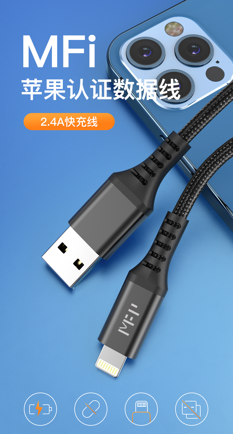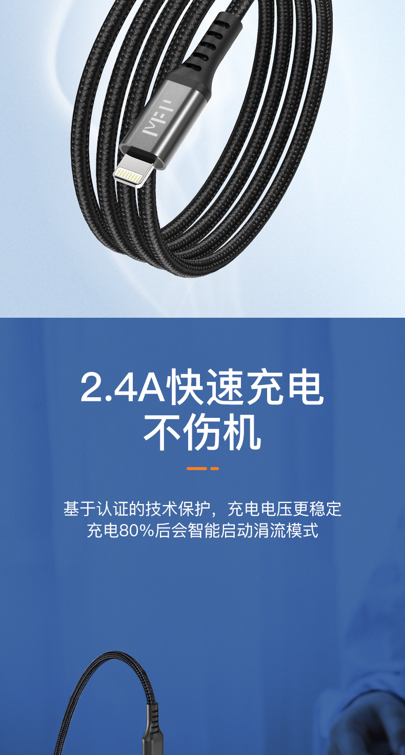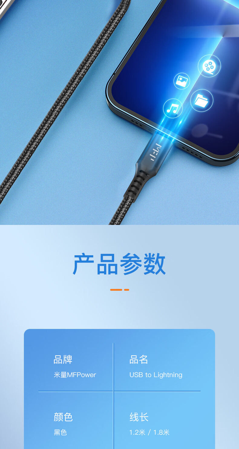 米量(MFPower)MFi认证苹果数据线快充充电线适用iPhone14/13/12/11/SE/iPad手机USB转Lightning电源数据传输线 MFi认证 2.4A 不弹窗 1.2米黑色编织