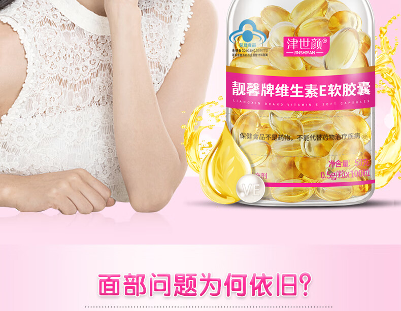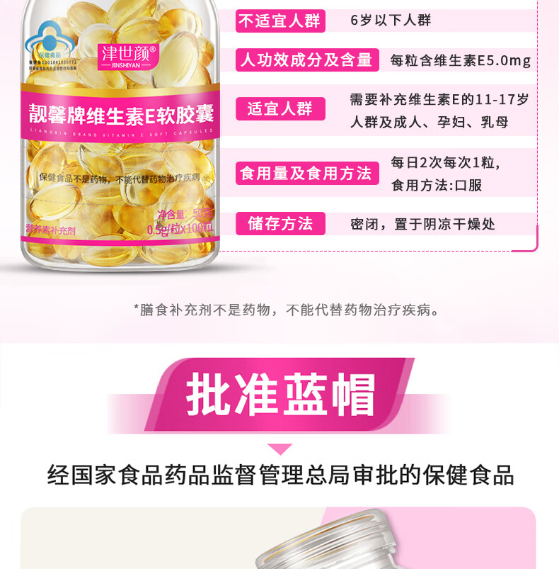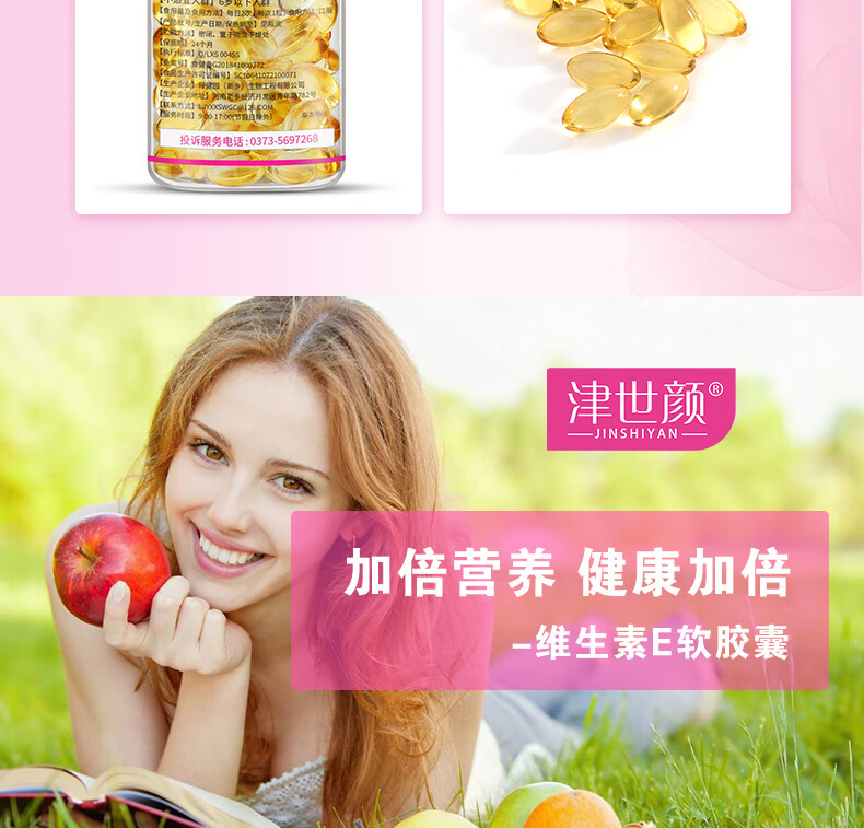津世颜 维生素E100粒 补充维生素e VE软胶囊 女人保养滋润营养 100粒x1瓶