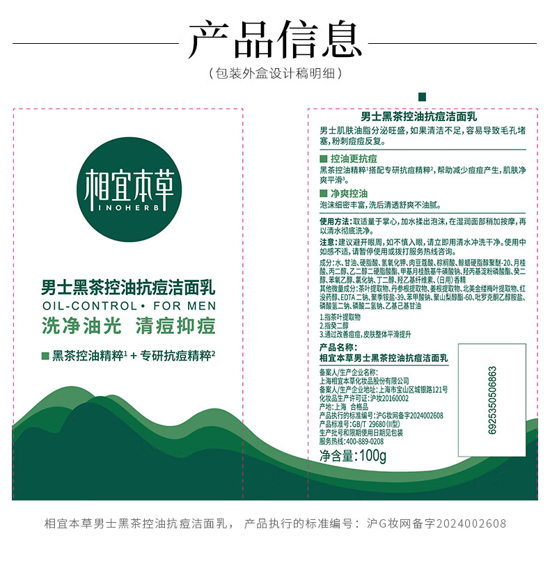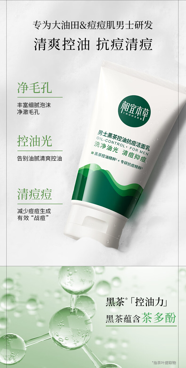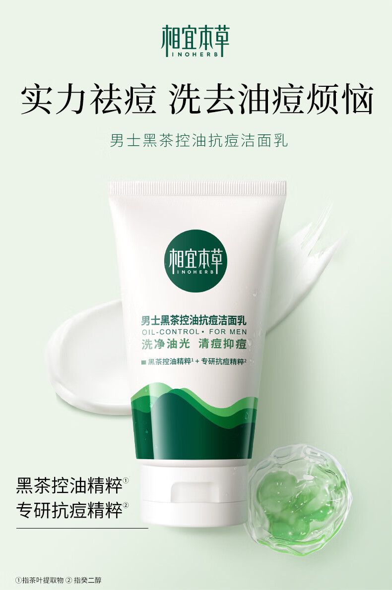 相宜本草男士黑茶控油抗痘洁面乳100g男士护肤洗面奶男士护肤品