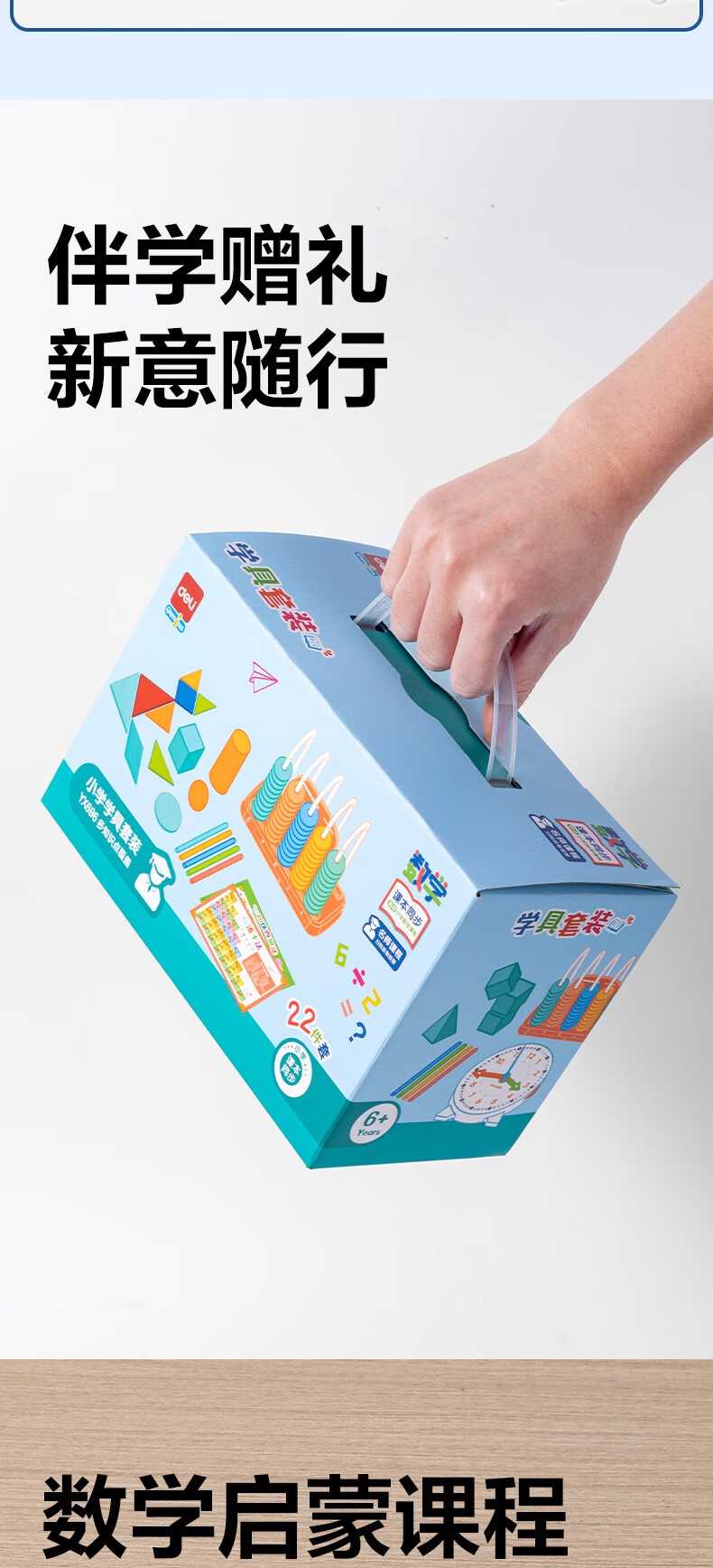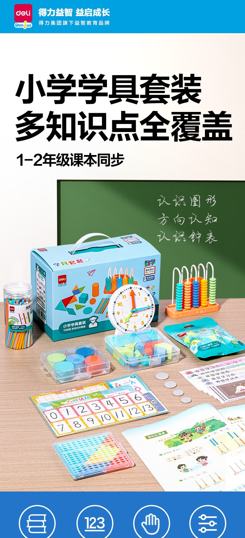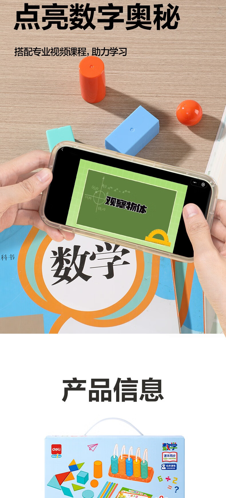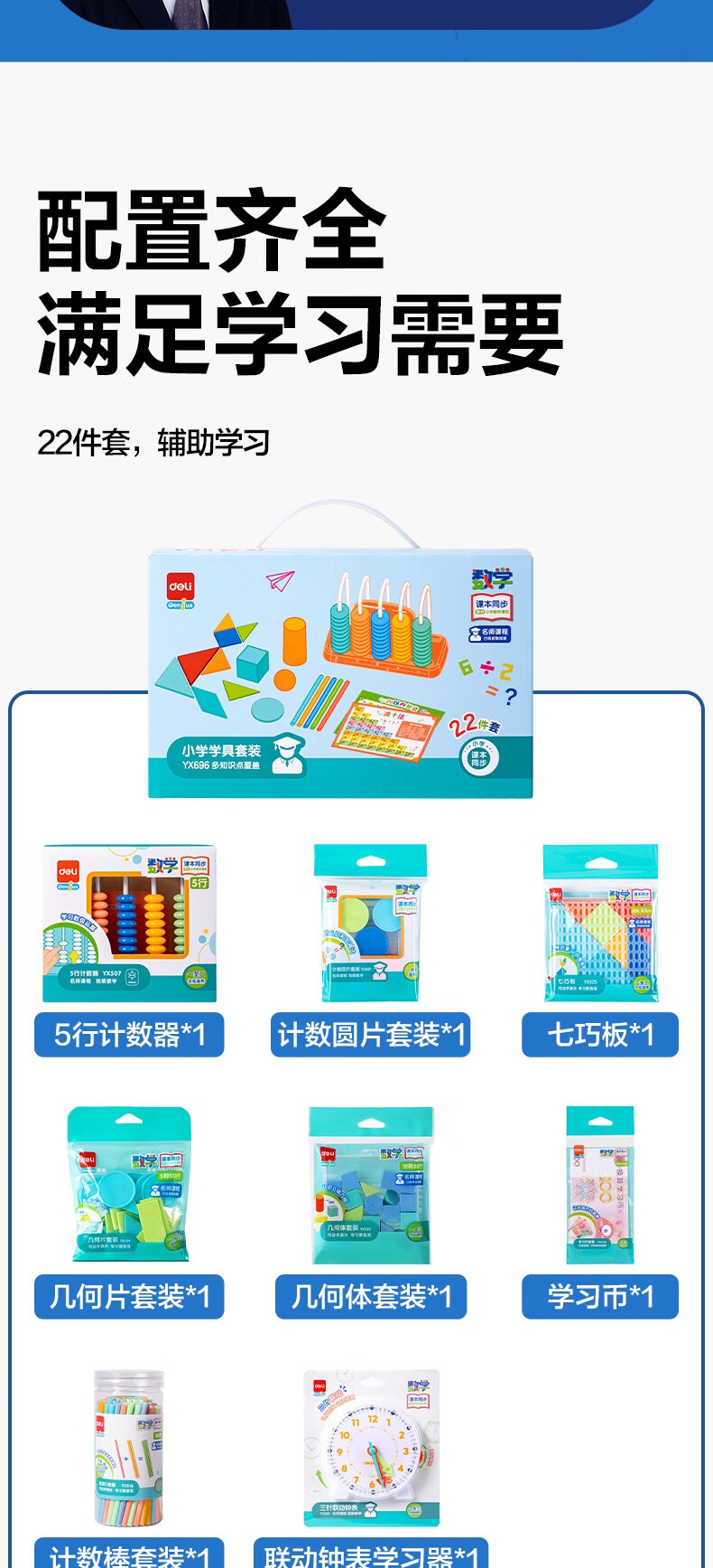得力(deli)1-2年级小学数学学具套装教材同步计数器计数棒立体几何知识卡片学习卡开学季文具22件套