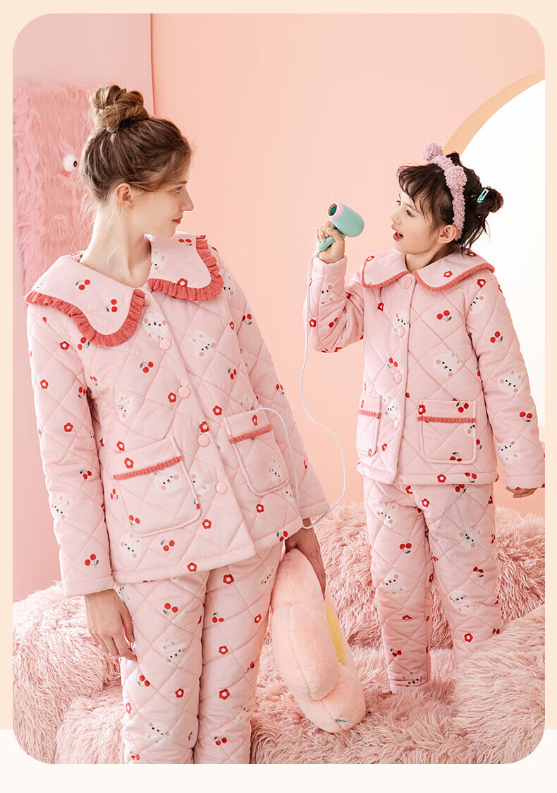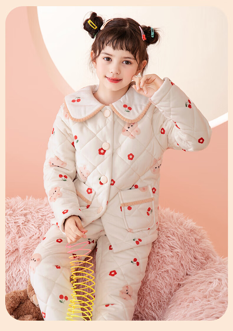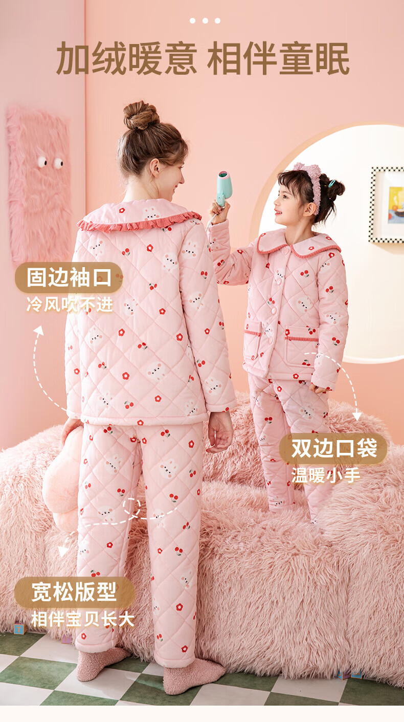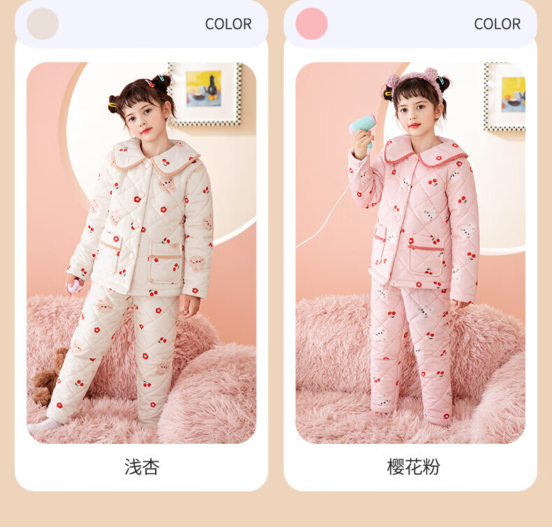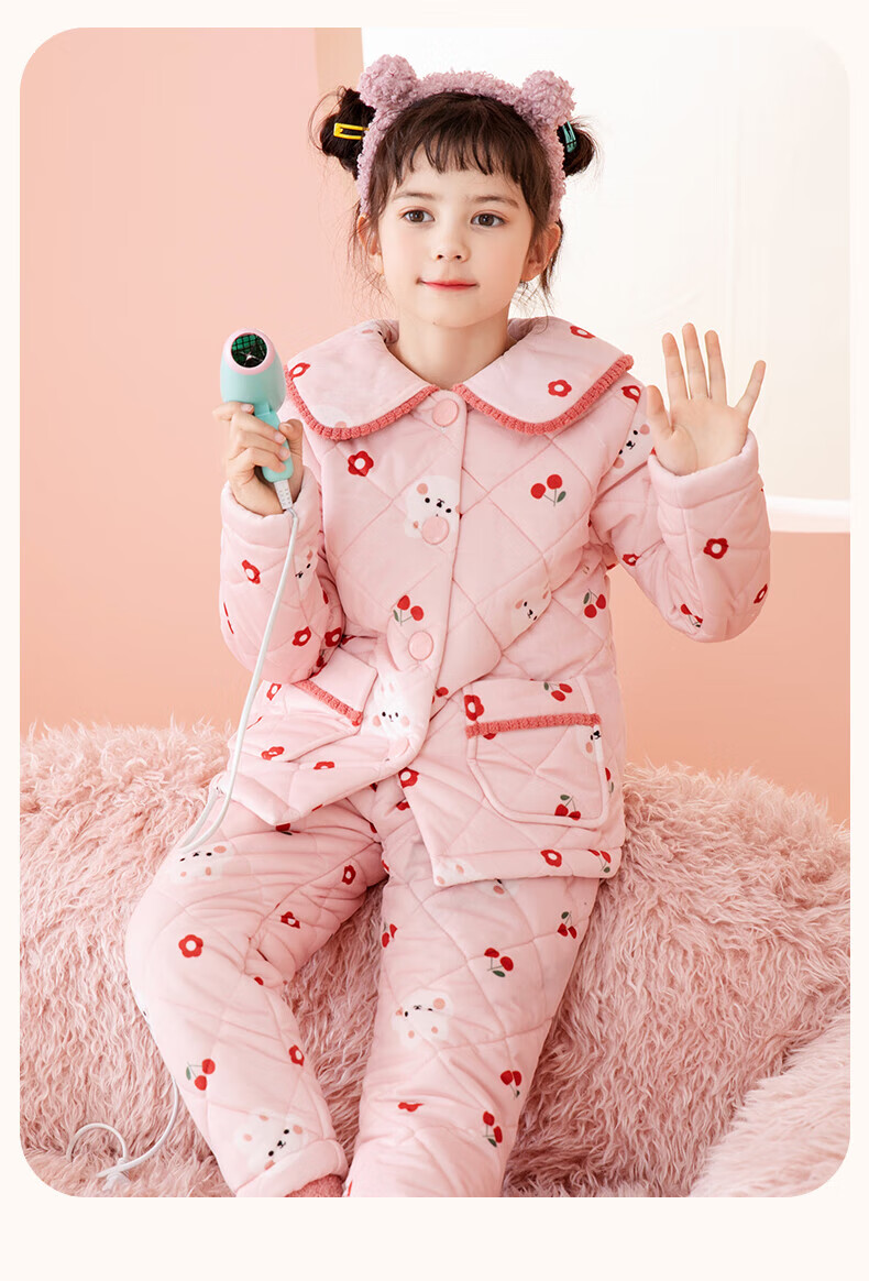 芬腾睡衣女童秋冬夹棉加厚娃娃领开衫暖绒防静电家居服童装套装1 樱花粉 130