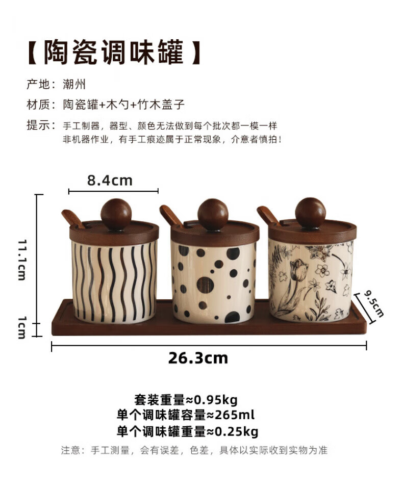 AILUKI日本调料盒套装调料瓶厨房家用陶瓷调味瓶罐盐罐组合装辣椒罐子勺 竖条+繁花+波点+木底座【赠木勺+标签贴】