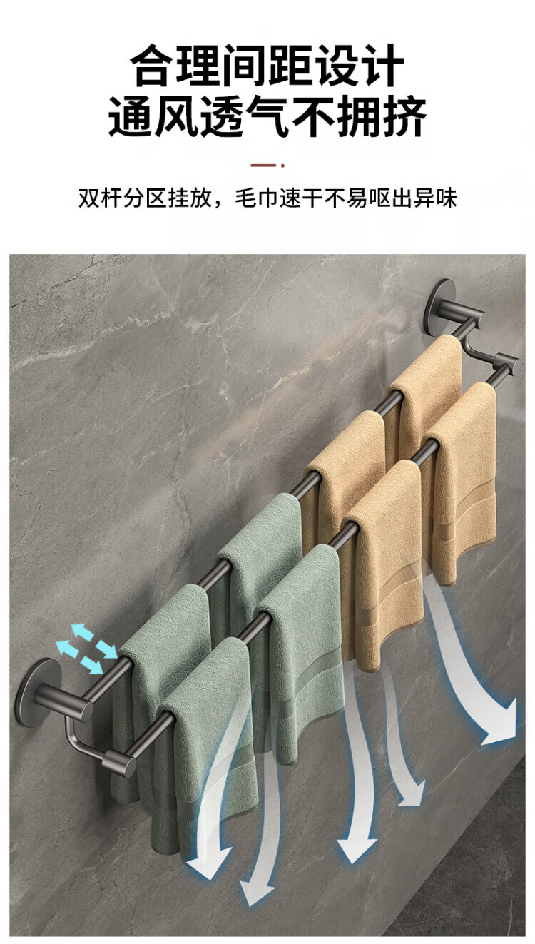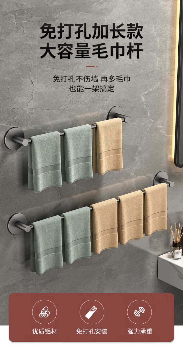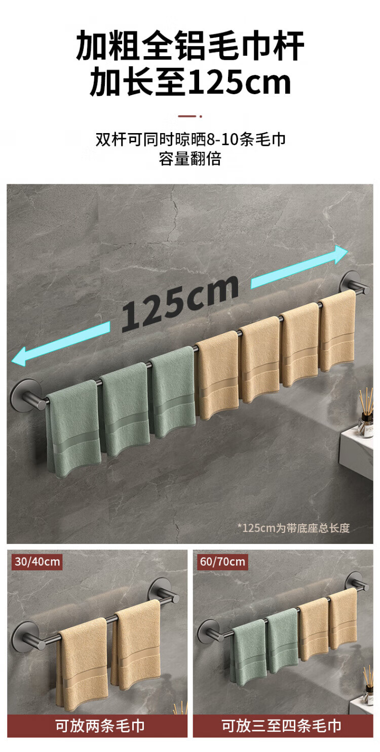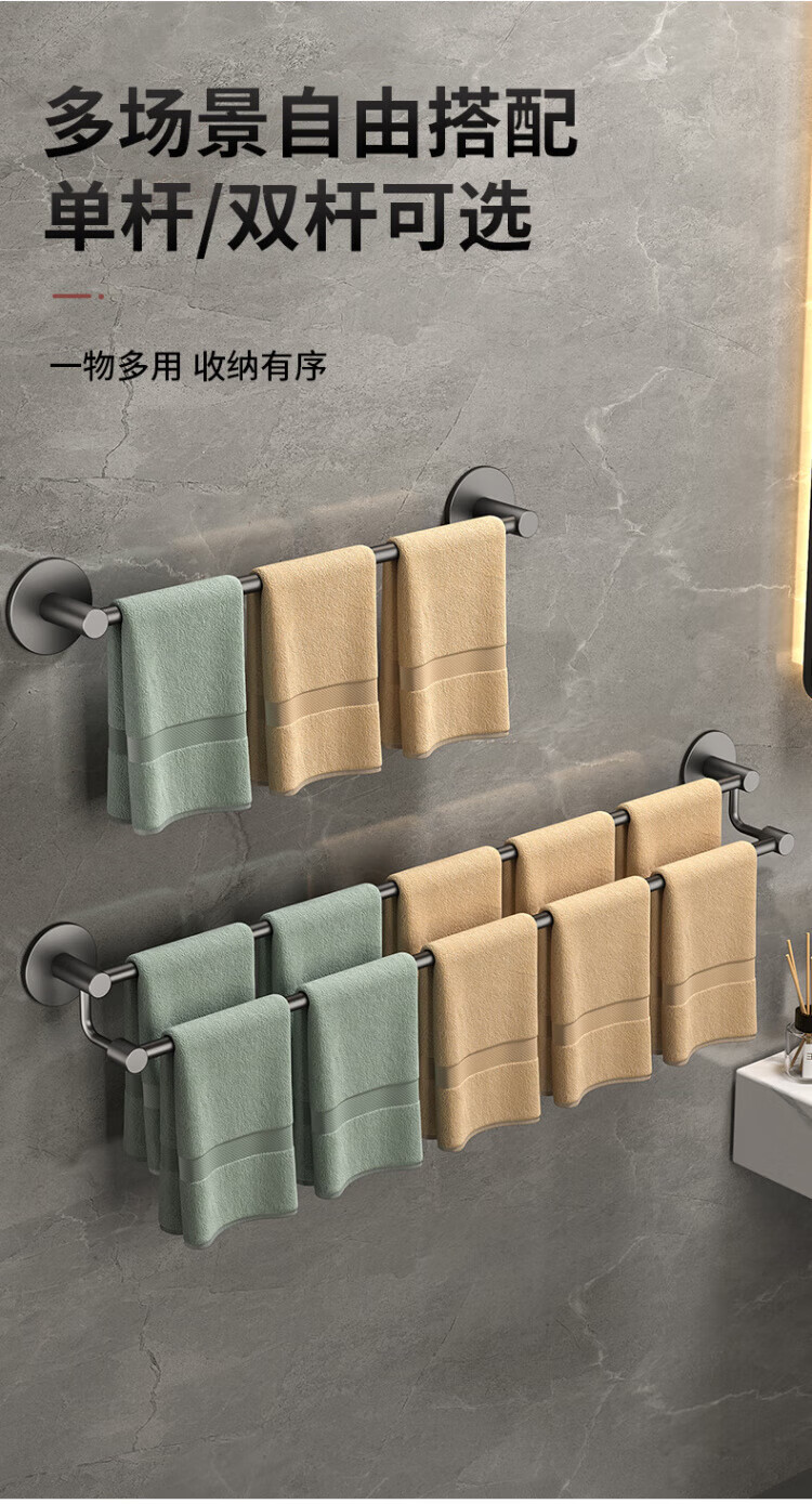 WCZ德国卫生间毛巾架加长单杆双杆免打孔浴室置物架厕所晾毛巾浴 枪灰色 | 双杆毛巾架-55cm