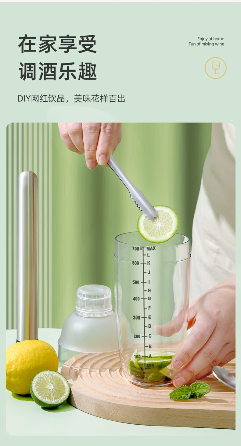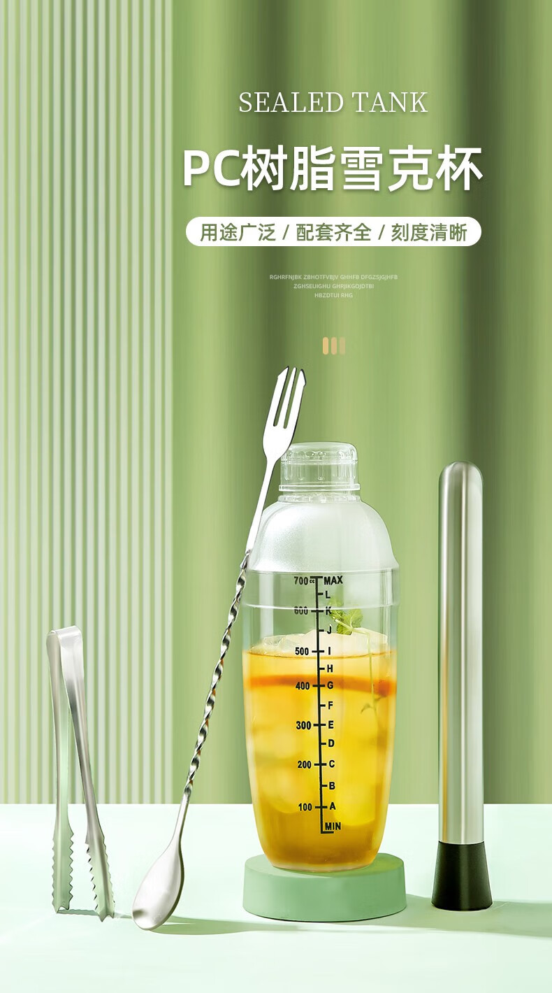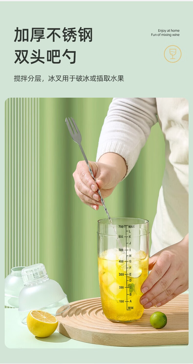京严暴打柠檬茶工具雪克杯套装捣汁棒碎冰锤雪克壶防溅盖手摇杯调酒器 套装-雪克杯+碎冰棒+量杯+吧勺 700ml大容量-升级防飞溅