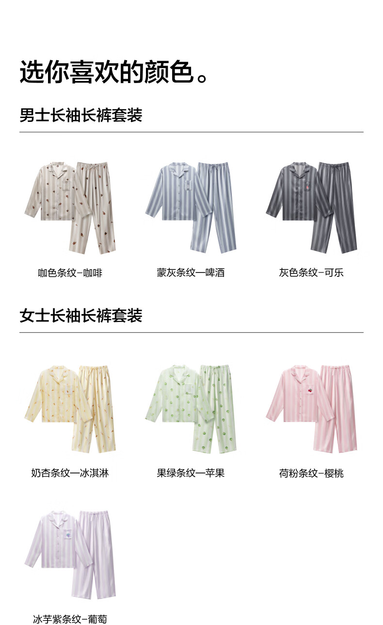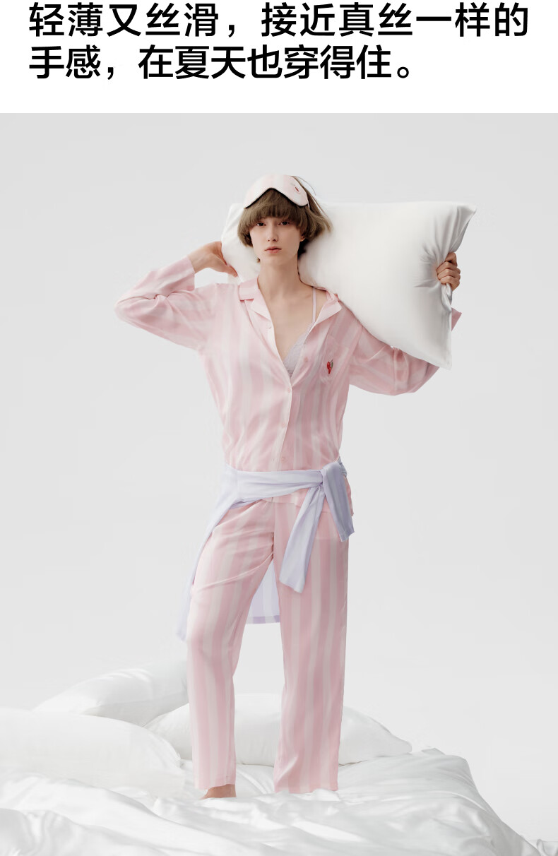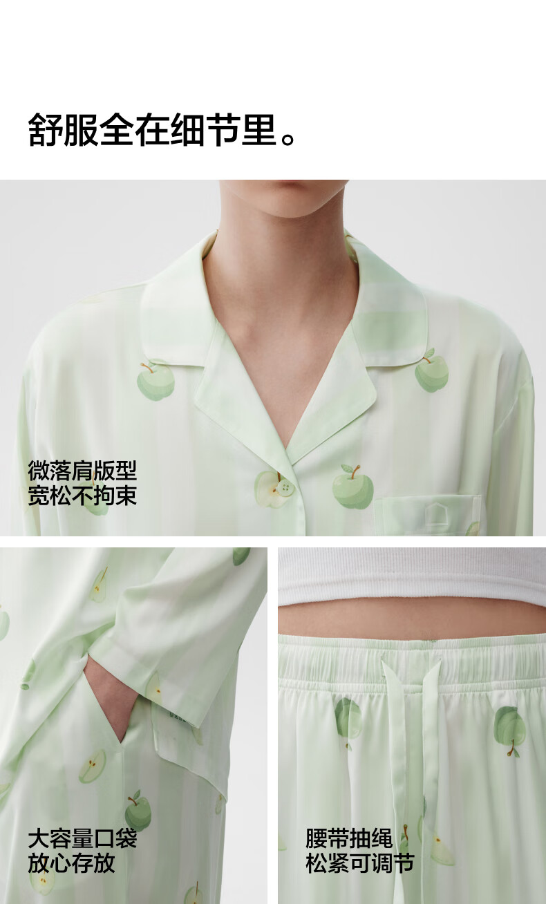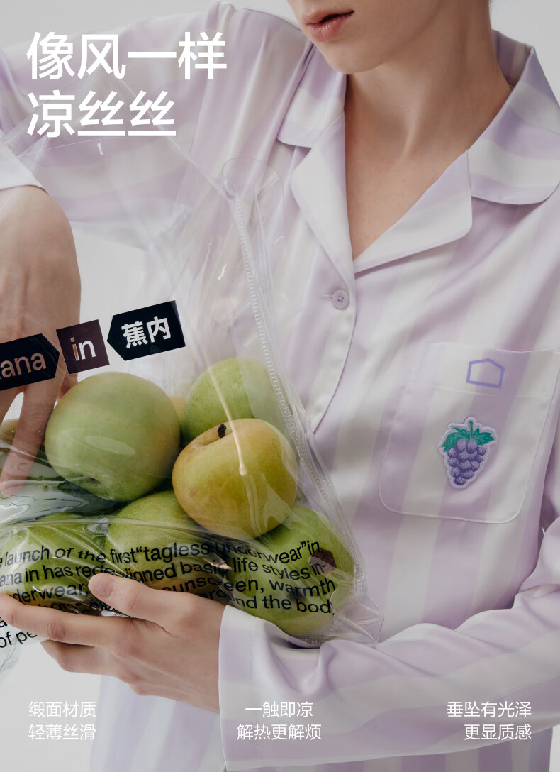 蕉内520H超级市场男女士睡衣缎面长袖长裤冰丝凉感情侣家居服春夏季新 【女士】果绿条纹—苹果 M