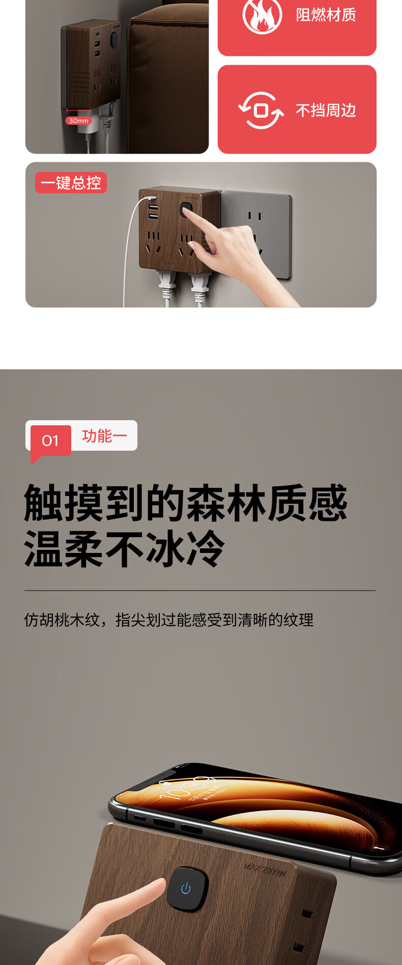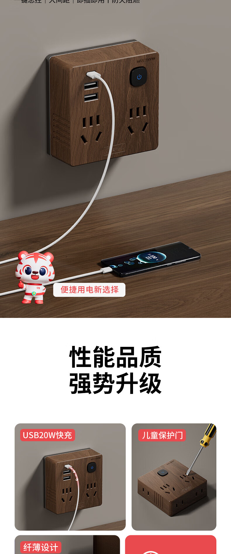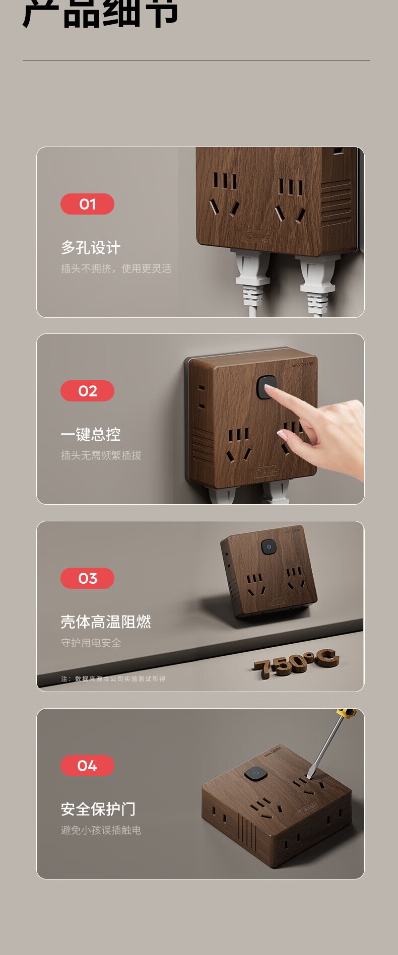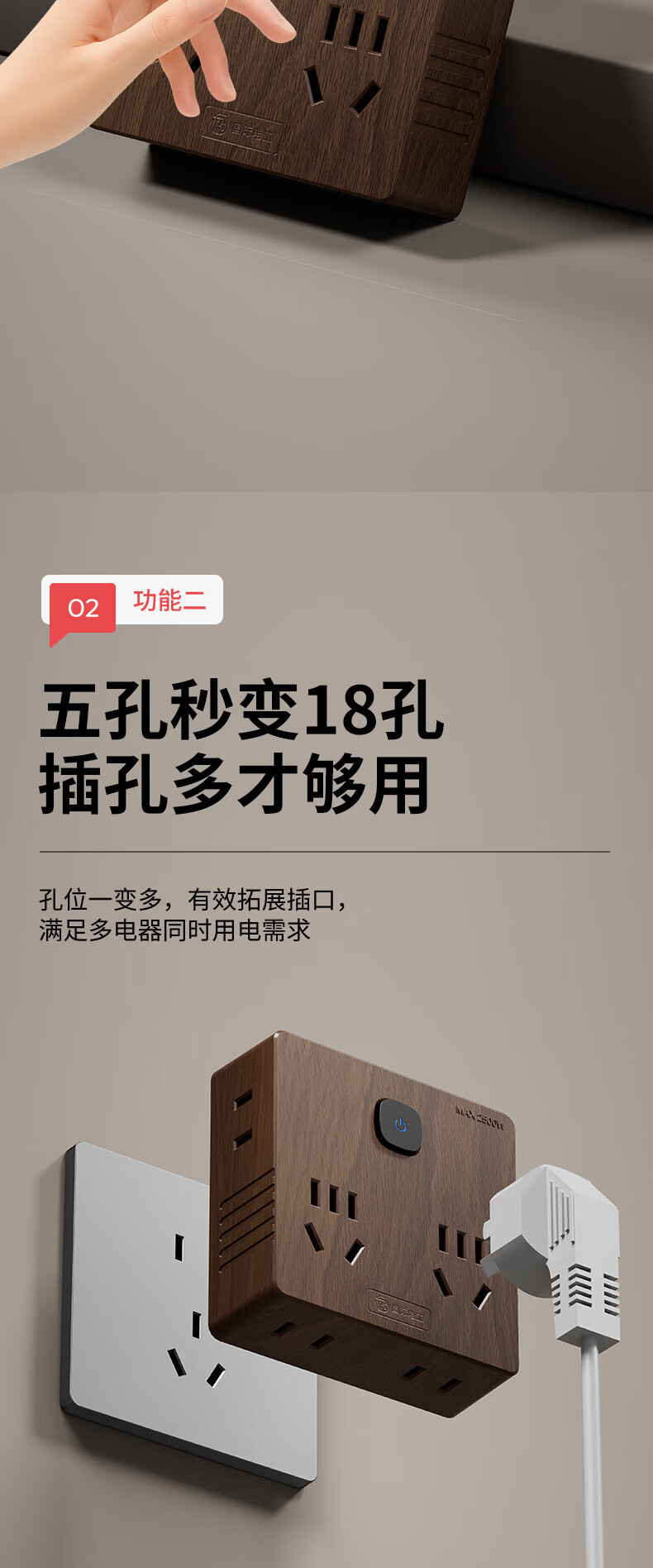 国际电工(FDD)86型扩展插座一转多功能墙壁转换插头床头书桌直插式无线转换器 胡桃木色丨一转四插座(14孔)