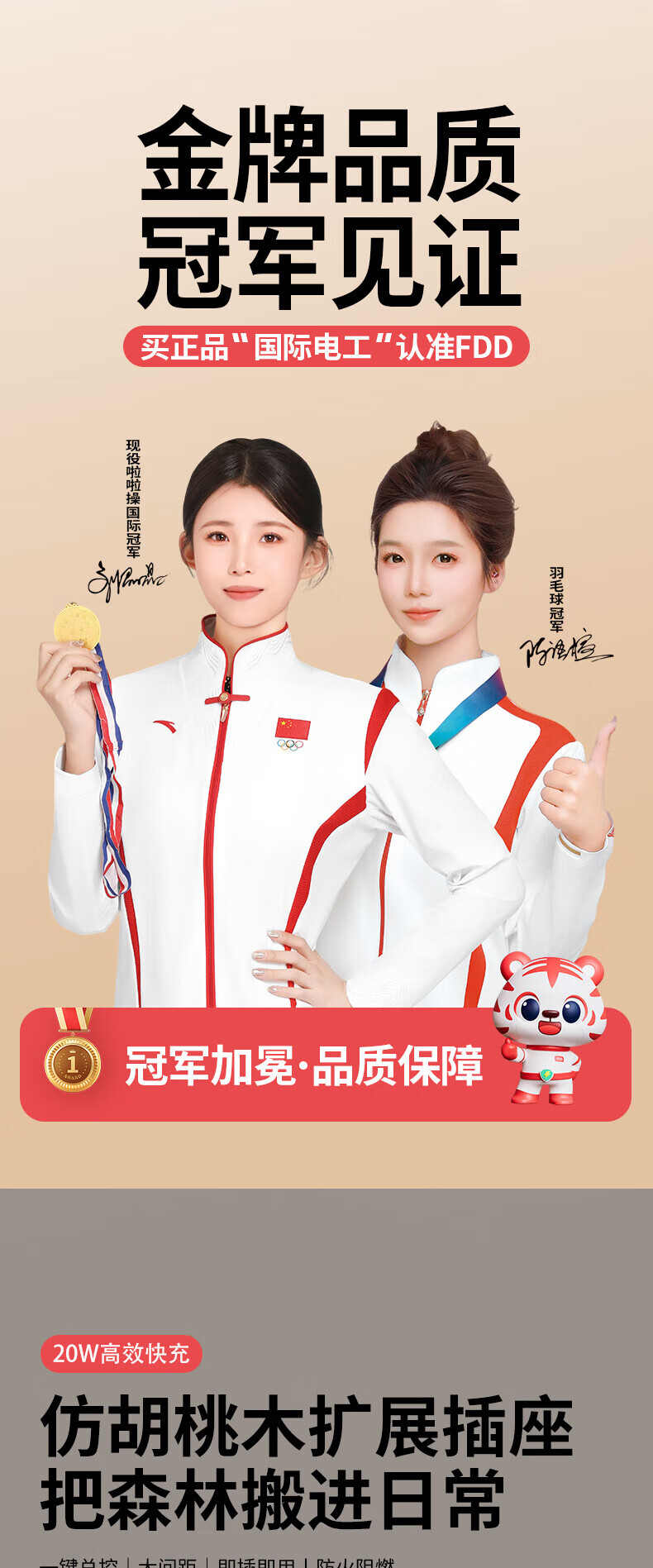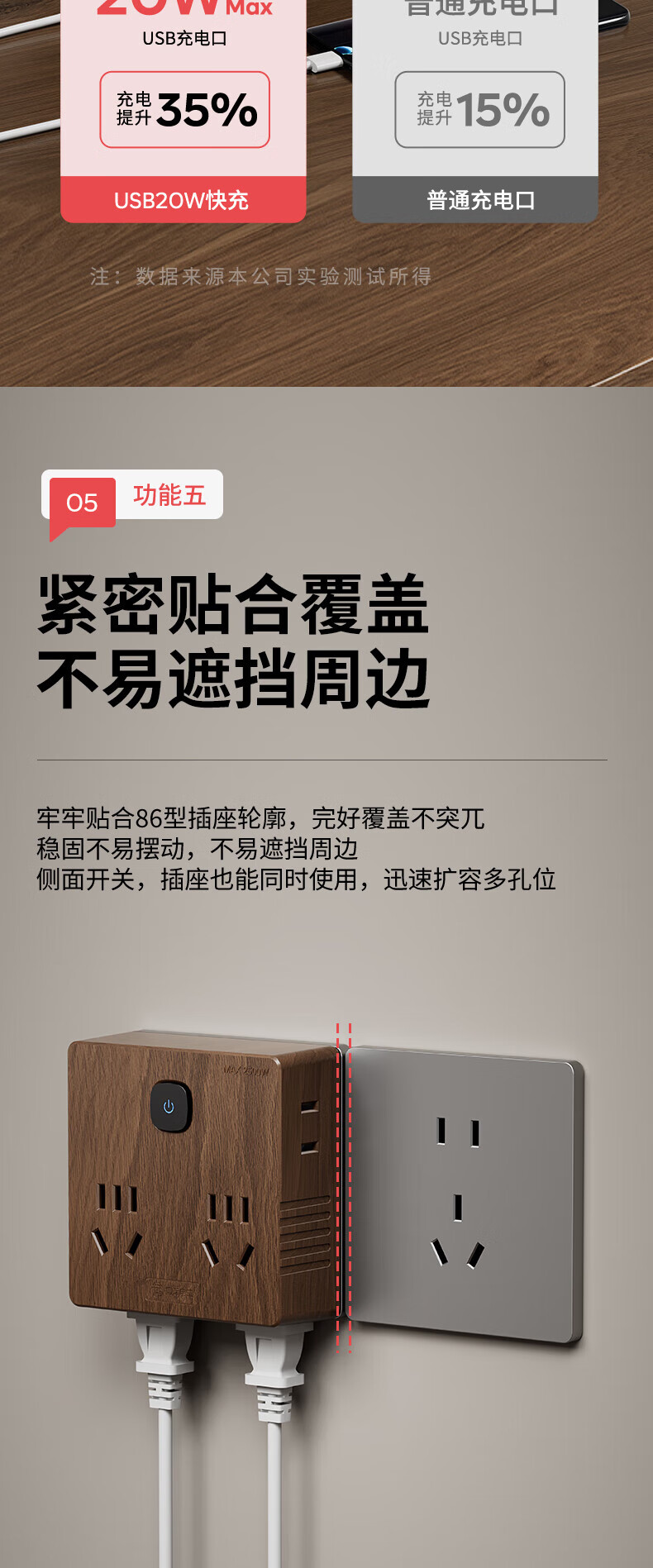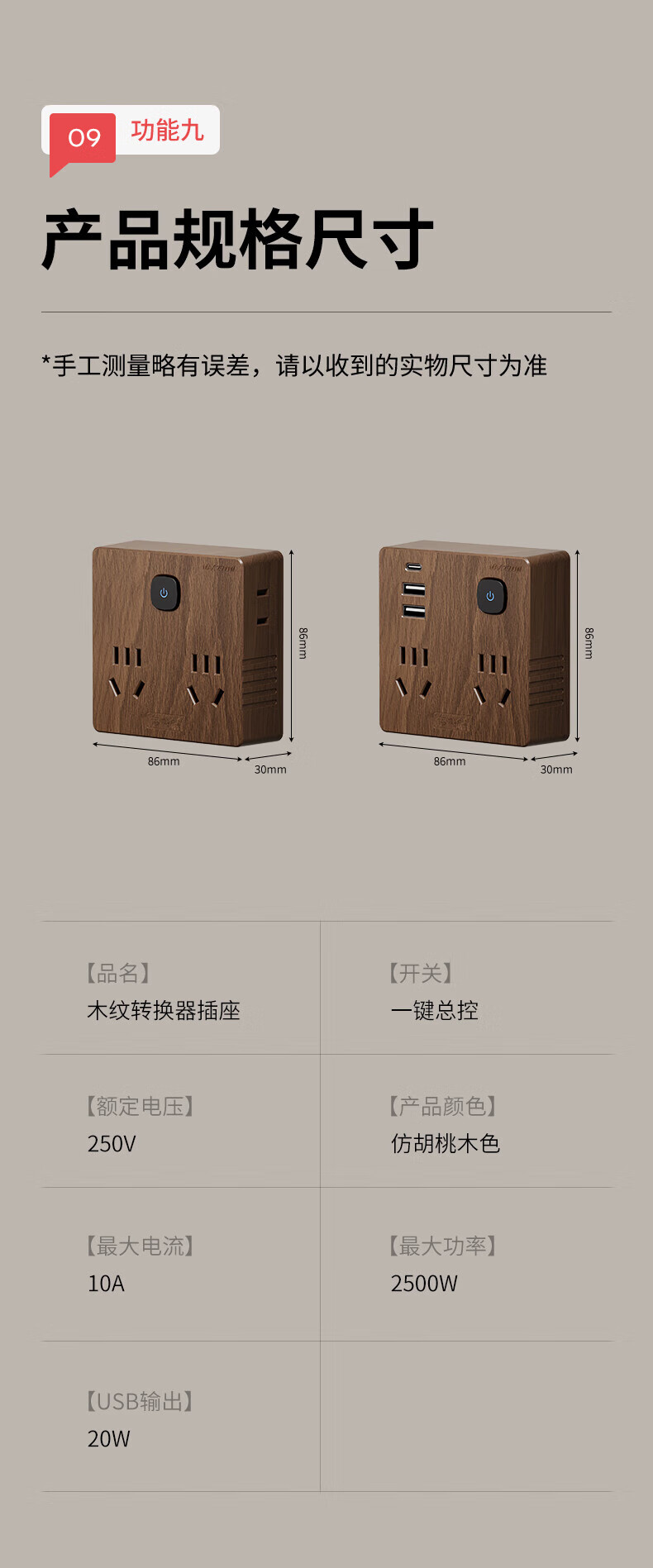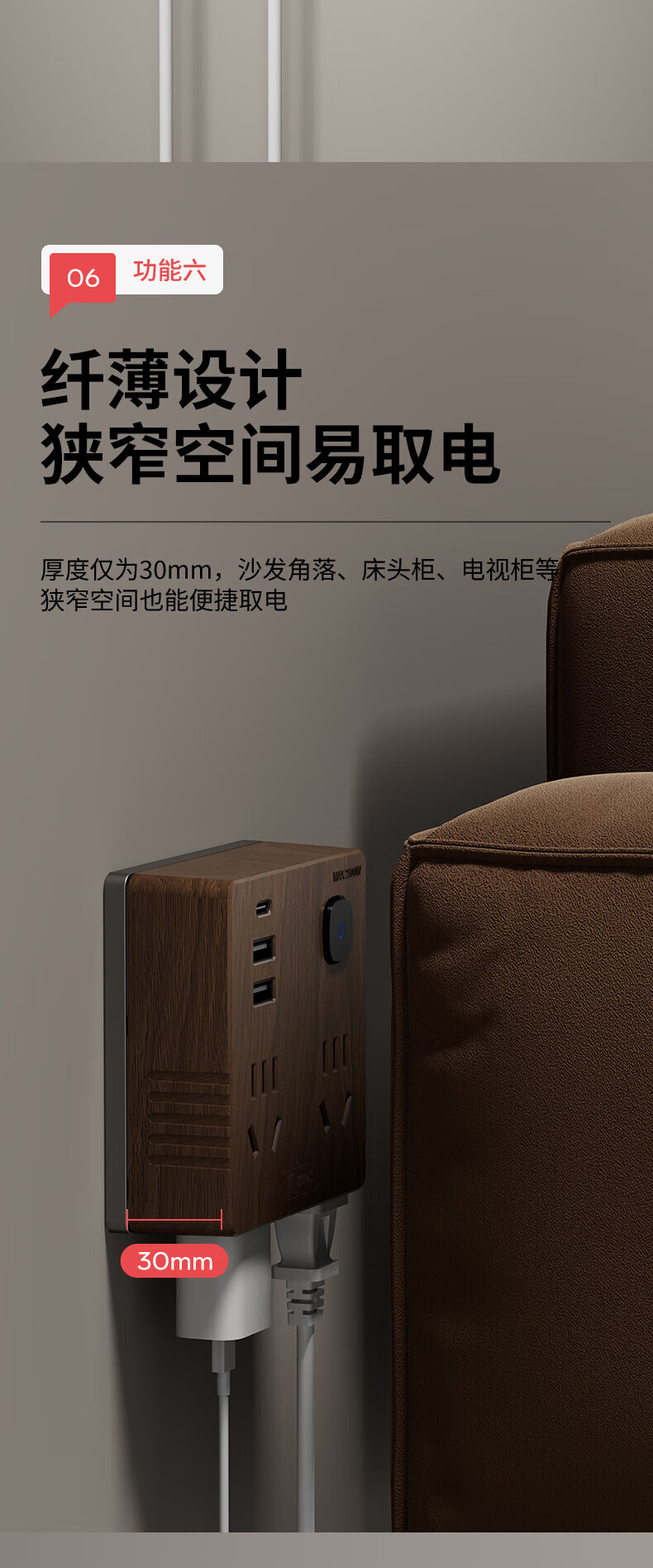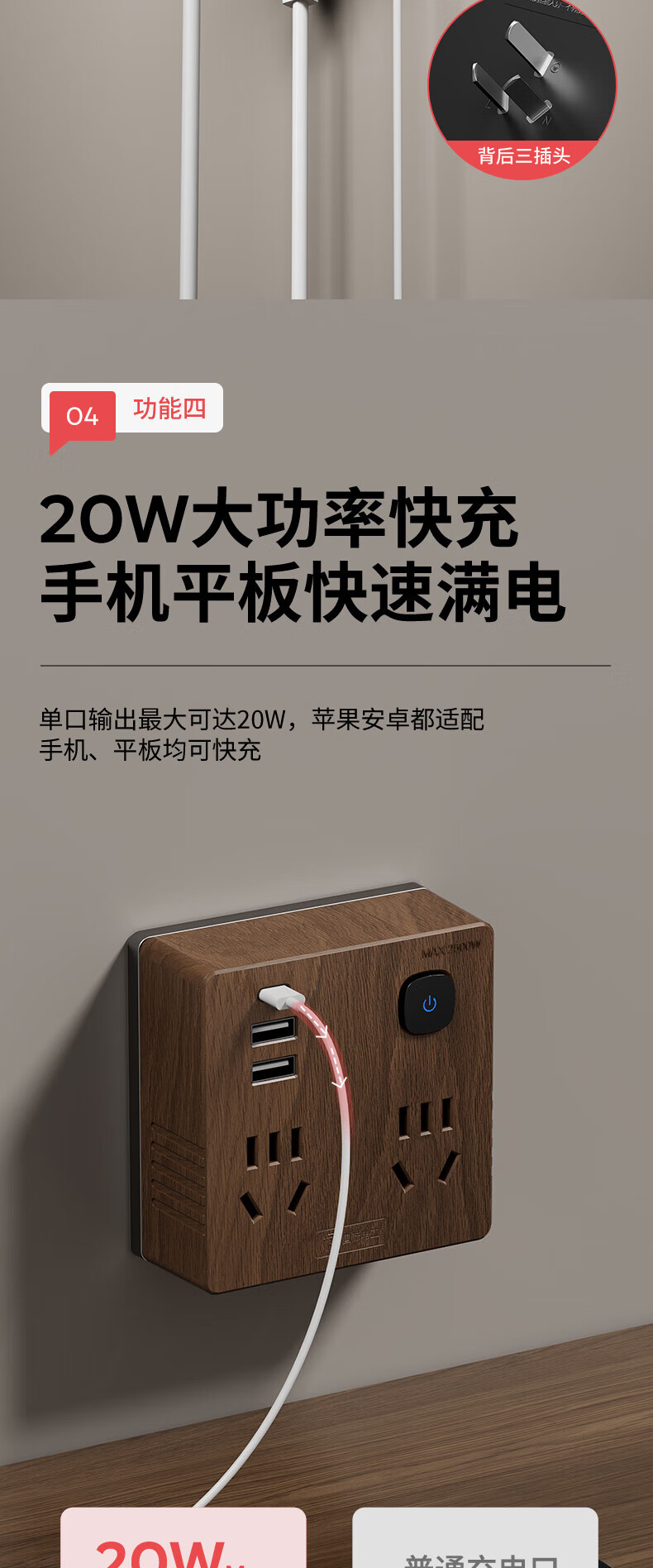 国际电工(FDD)86型扩展插座一转多功能墙壁转换插头床头书桌直插式无线转换器 胡桃木色丨一转四插座(14孔)