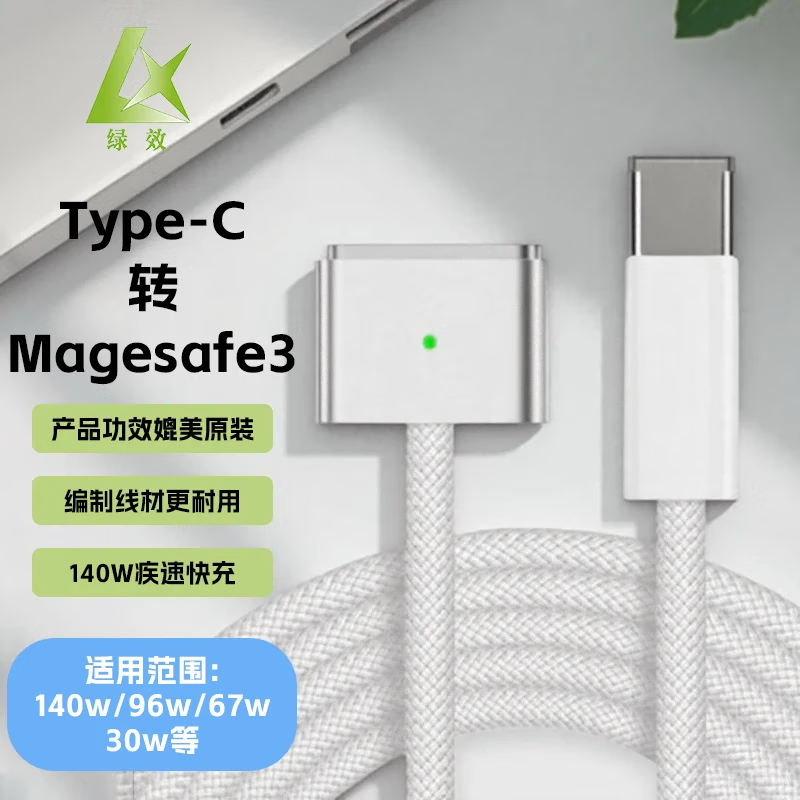 绿效140W磁吸快充线笔记本电脑充电线Magsafe3电源线Type-C转T型接口适用2024款MacBookAir/pro2米 双typec线PD100w超级闪充