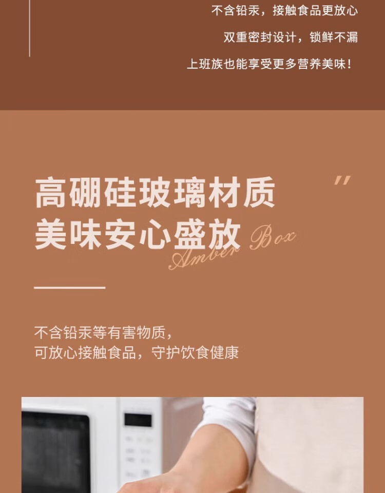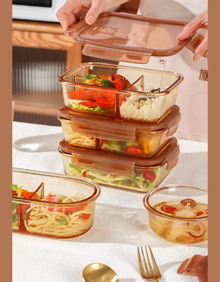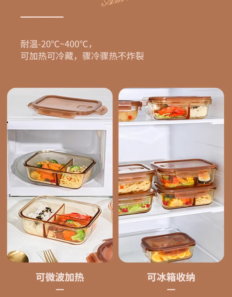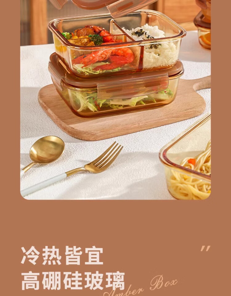 希乐扣Cilock高硼硅耐热玻璃饭盒上班族带饭可微波炉便当盒保鲜盒 琥珀三隔+包