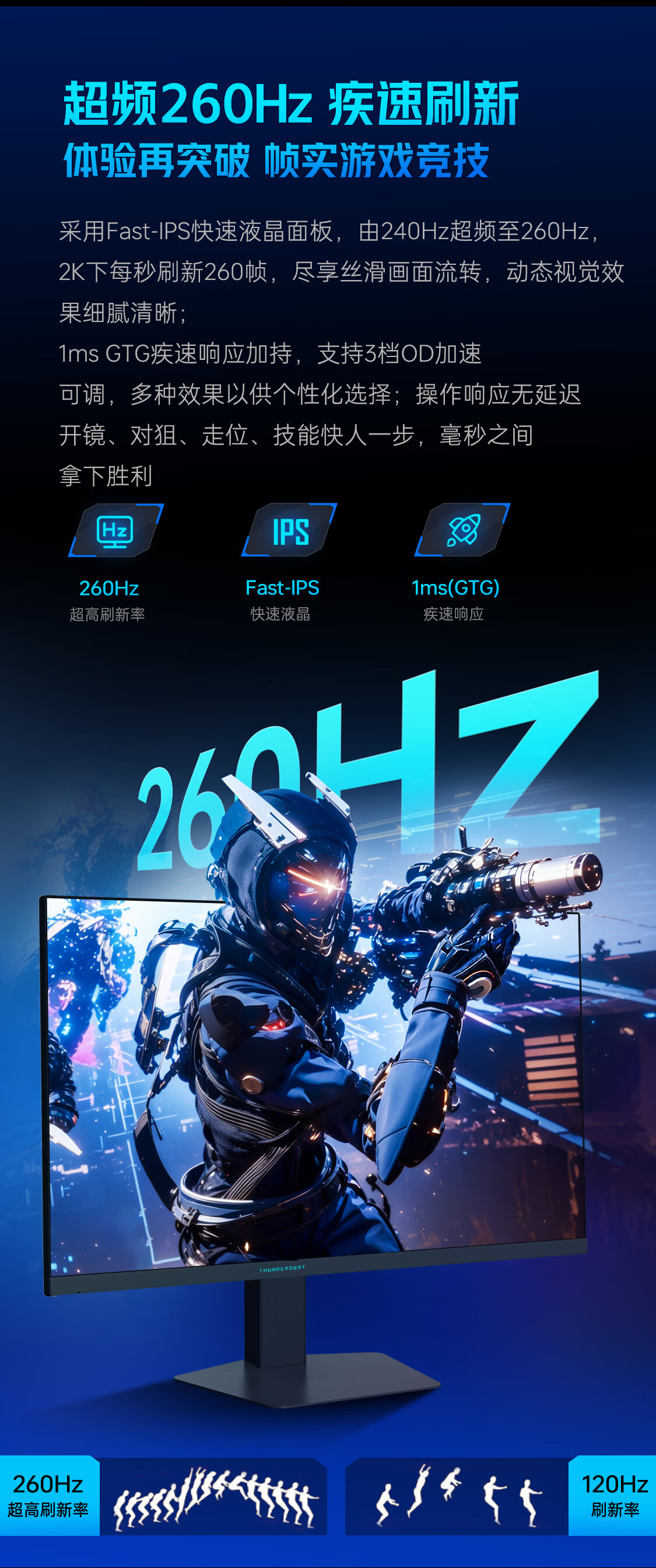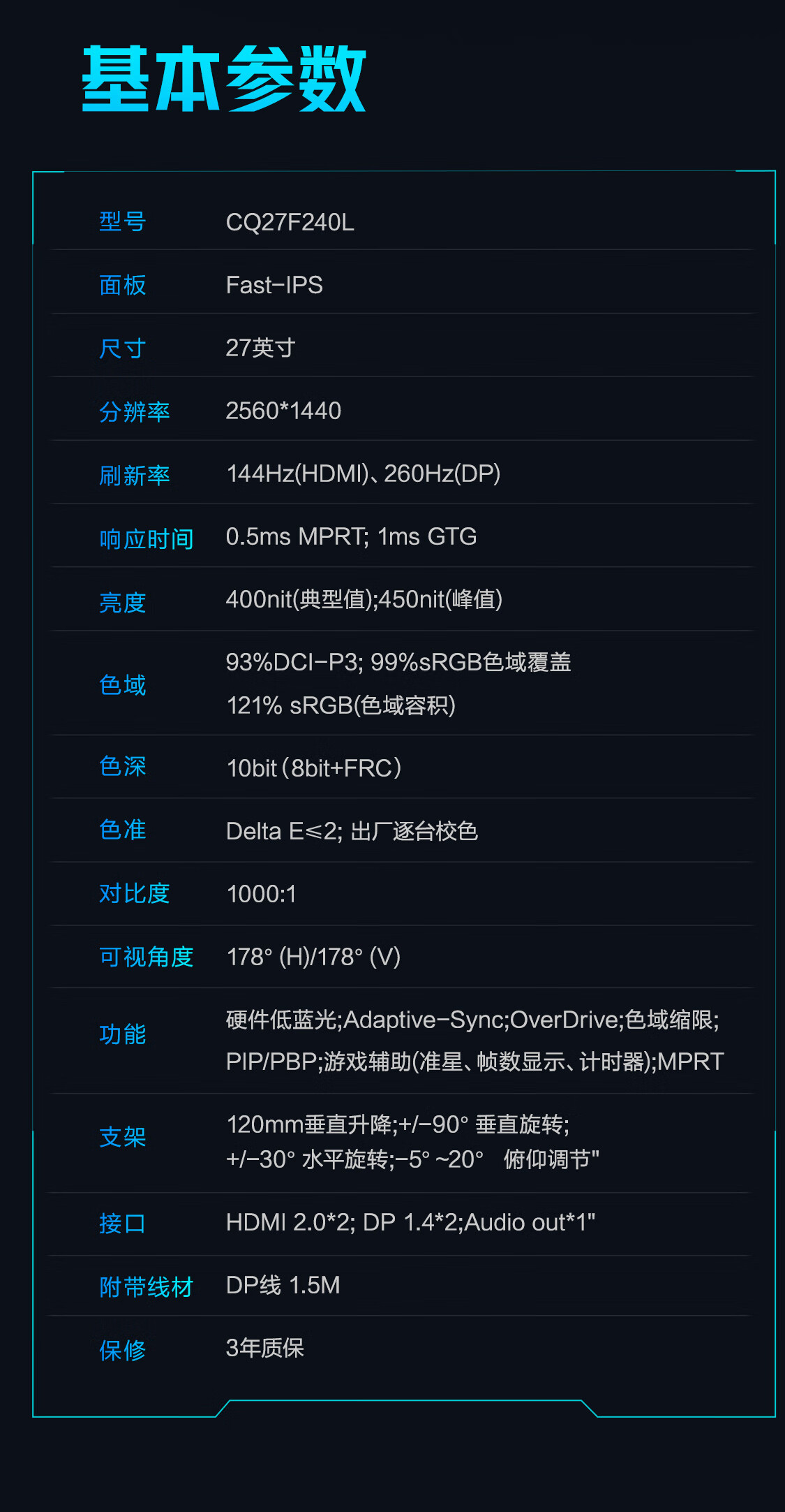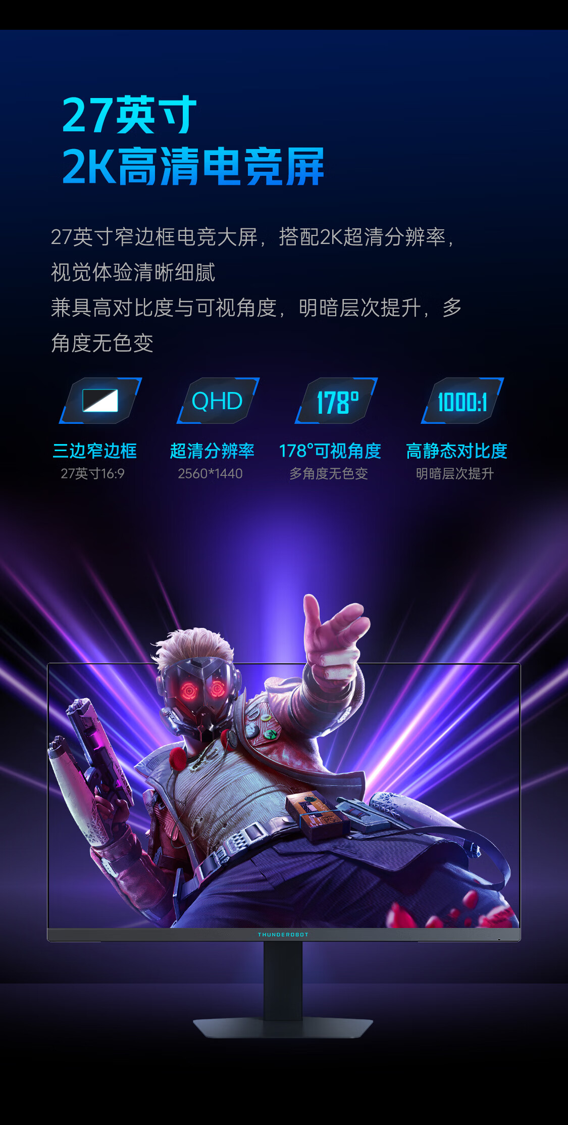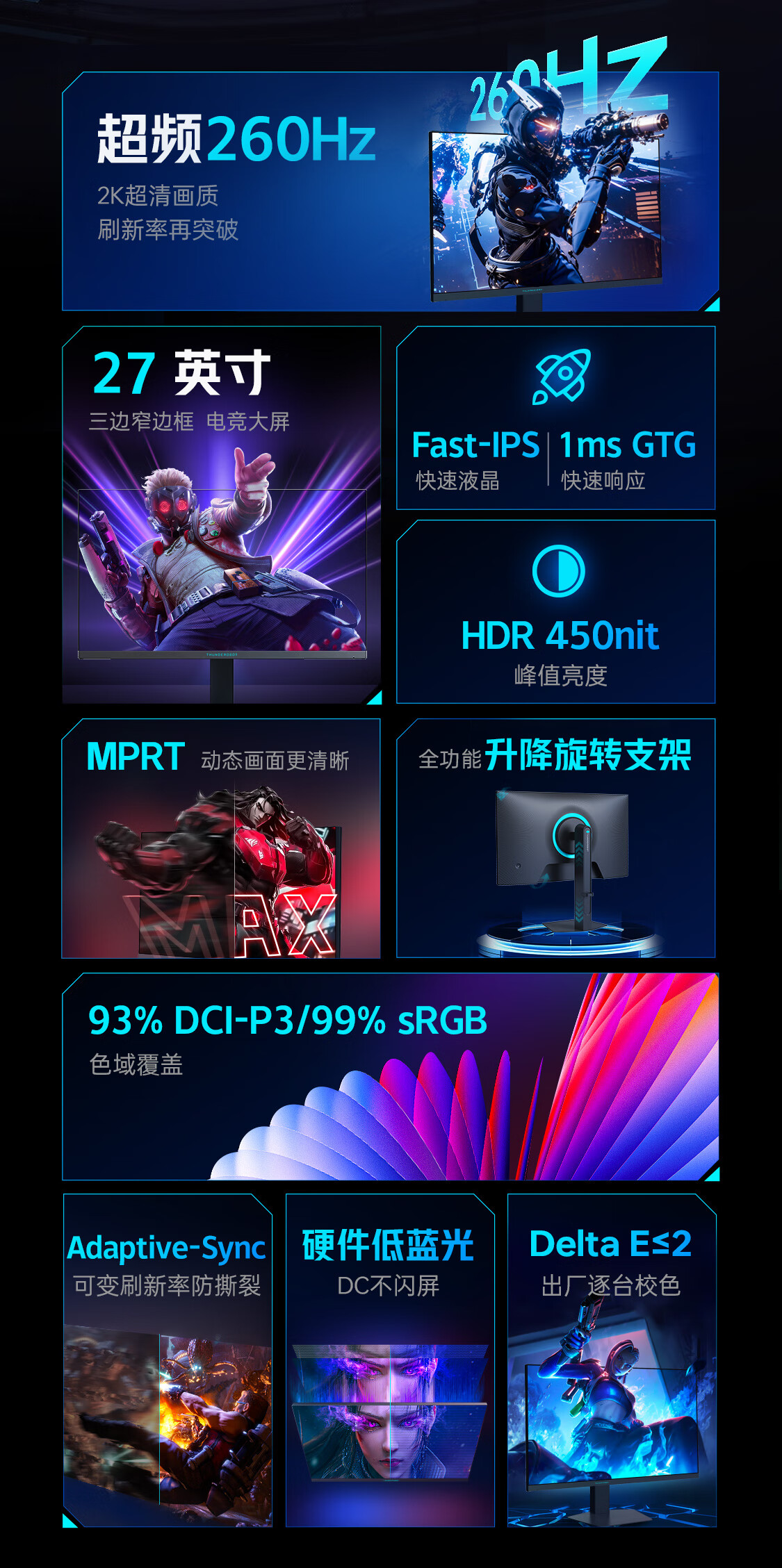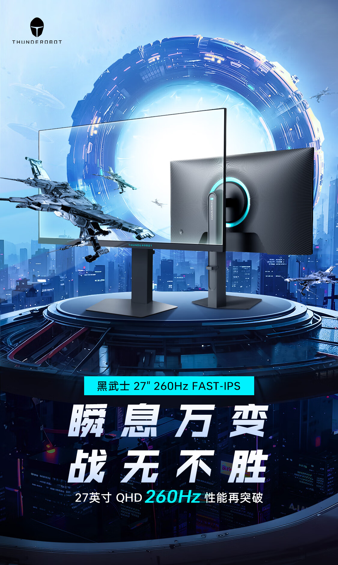 雷神27英寸2K 260Hz原生240 Fast IPS 450nit峰值 硬件低蓝光升降旋转电竞游戏电脑显示器CQ27F240L