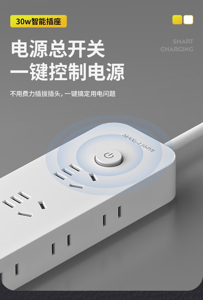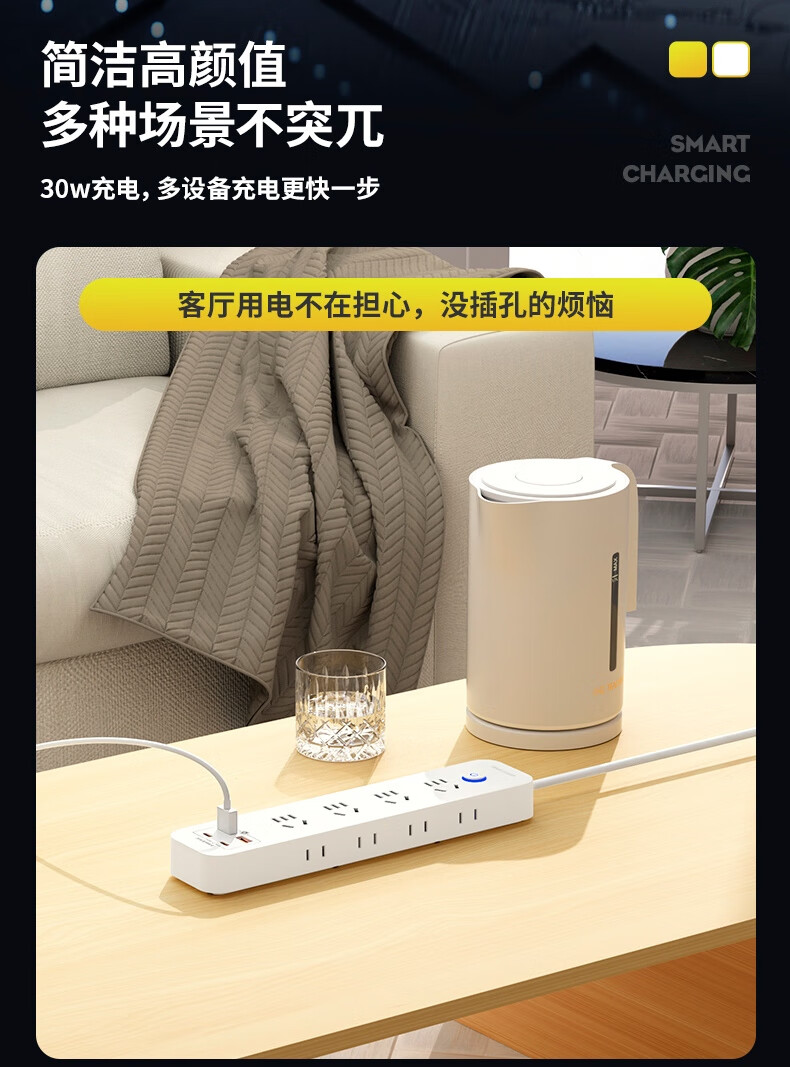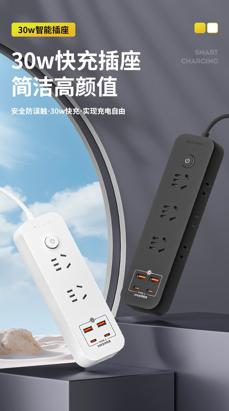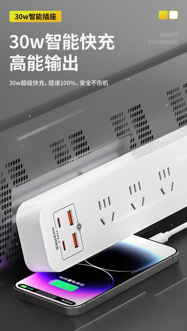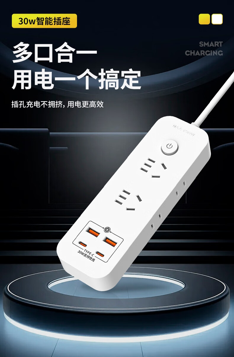 苏士赫尔摩【30W PD超级快充】扁头插排/插线板/排插/拖线板/接线板 2USB+2Type-C 4位总控 1.8米 白色便携款