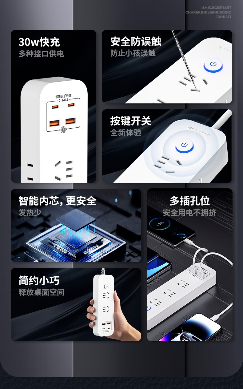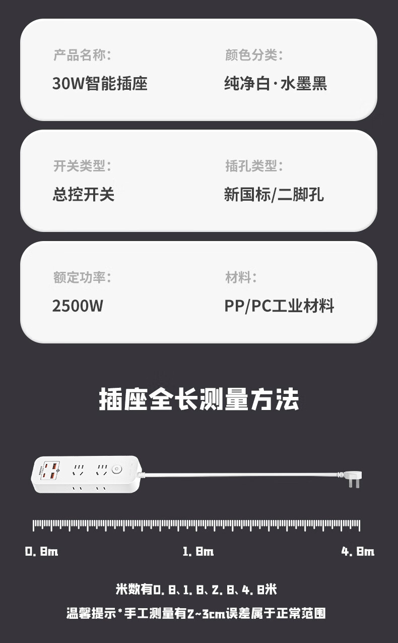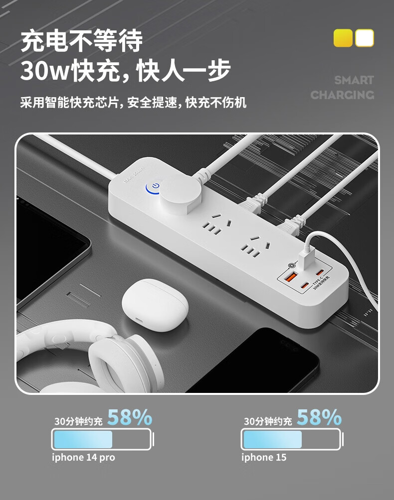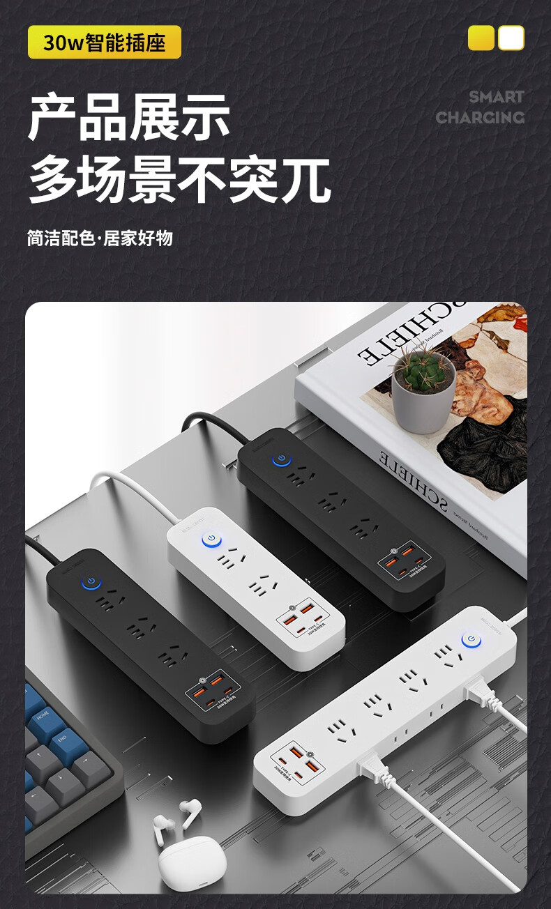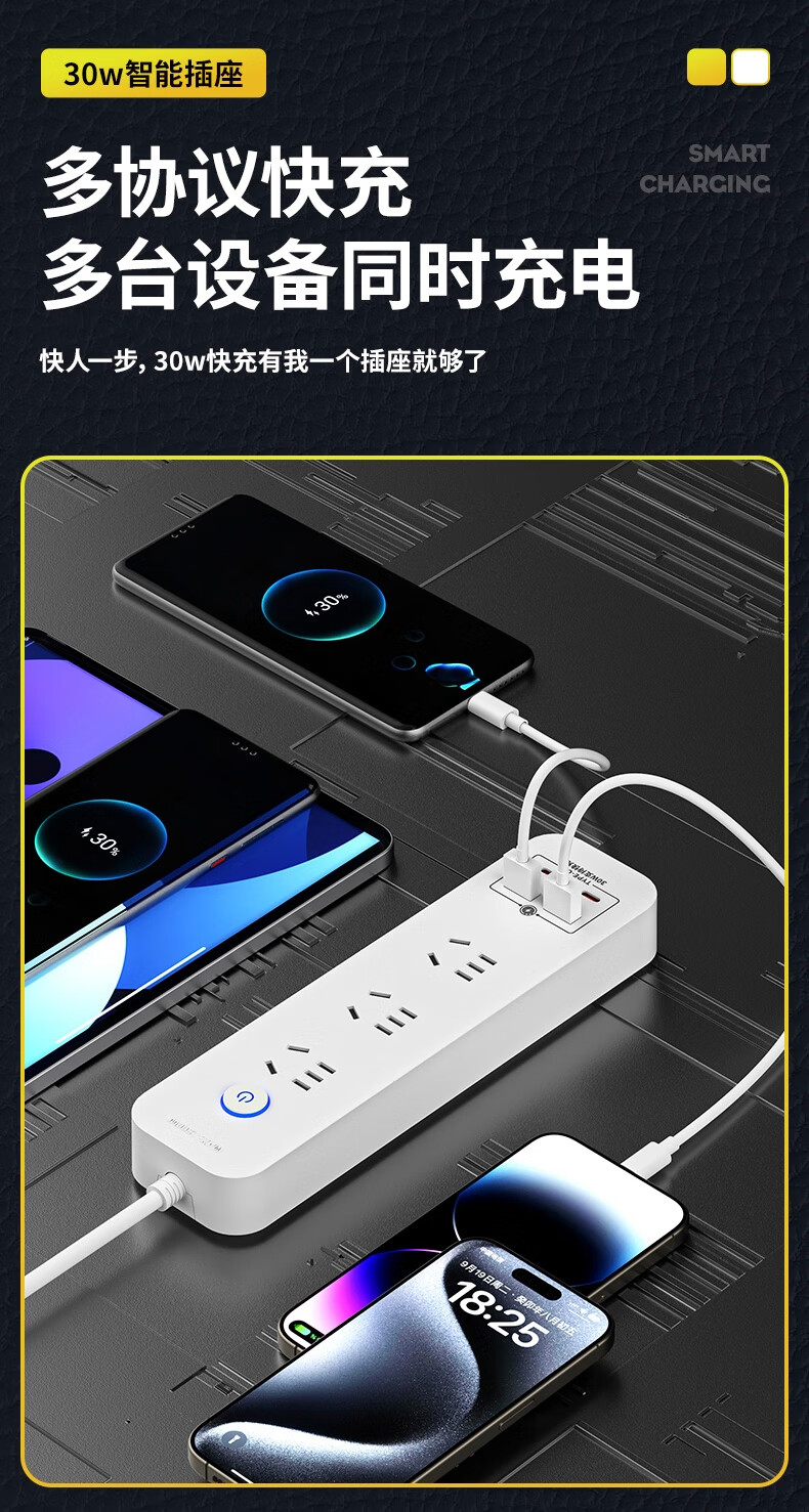 苏士赫尔摩【30W PD超级快充】扁头插排/插线板/排插/拖线板/接线板 2USB+2Type-C 4位总控 1.8米 白色便携款