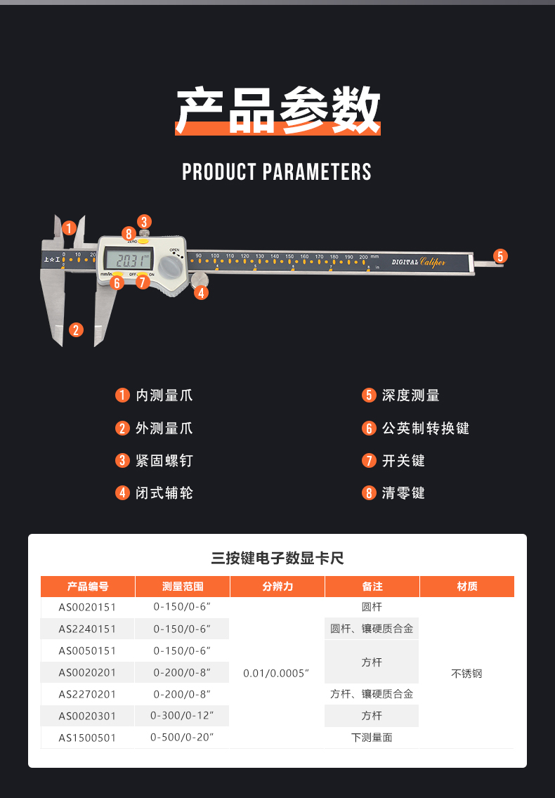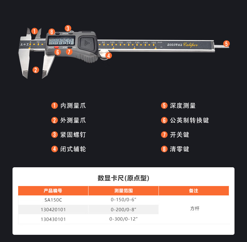 上工 原点型电子数显卡尺0-200mm 分度值0.01 绝对原点型 游标卡尺 不锈钢 高精度