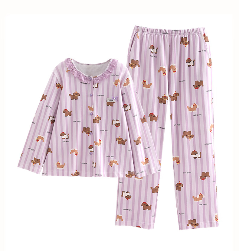 玛伦萨100%纯棉睡衣女2025新款春秋季长袖长裤大码女士家居服套装 灰紫 M