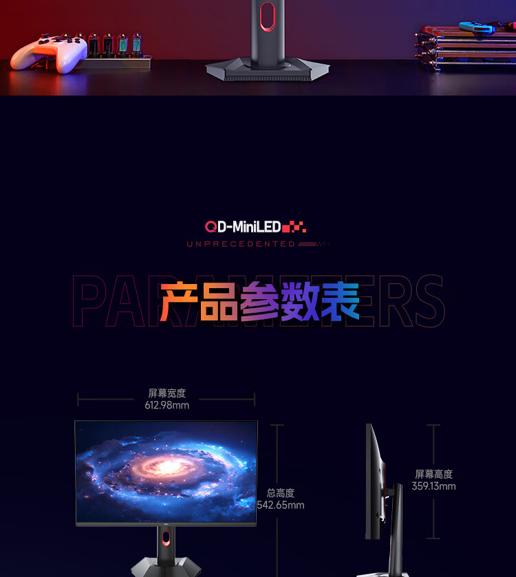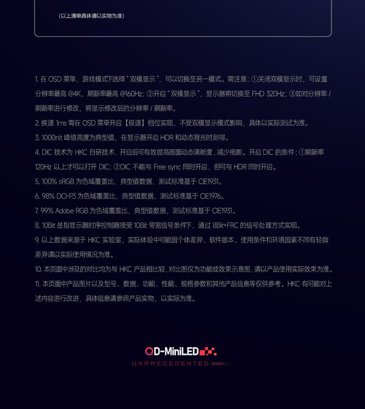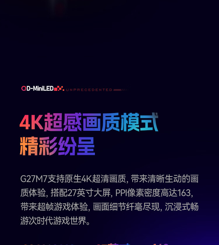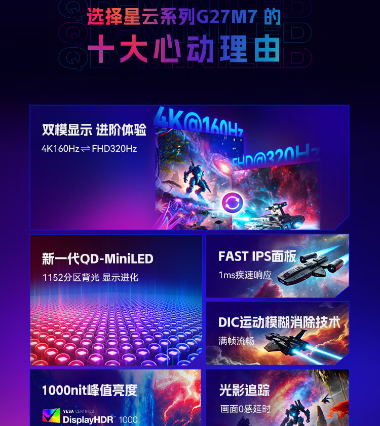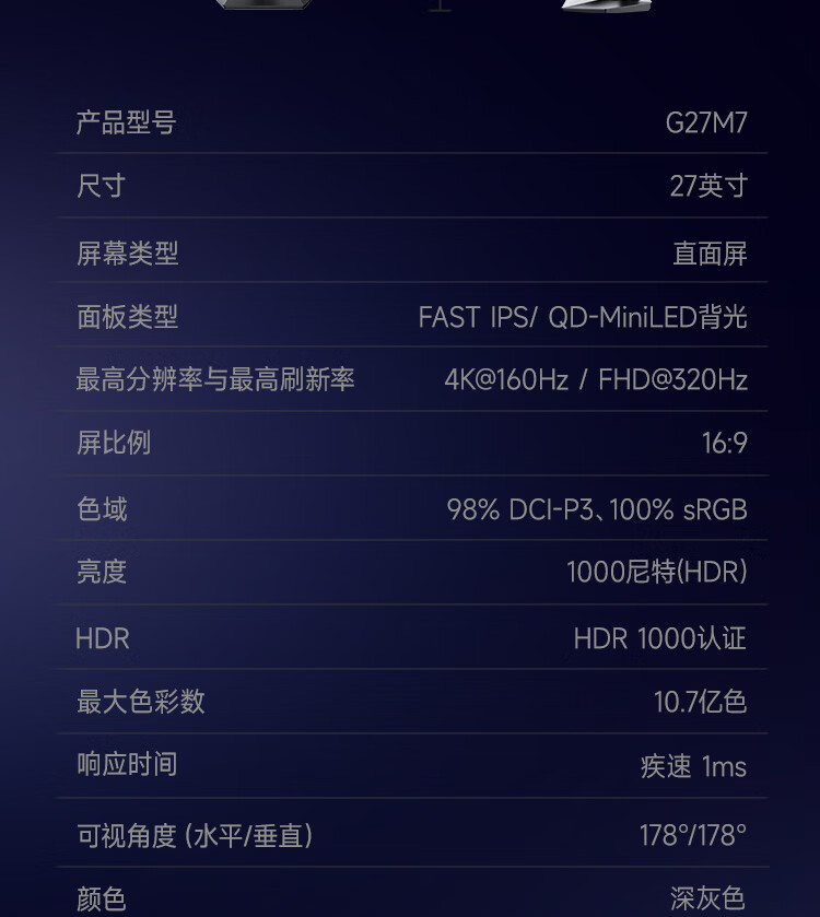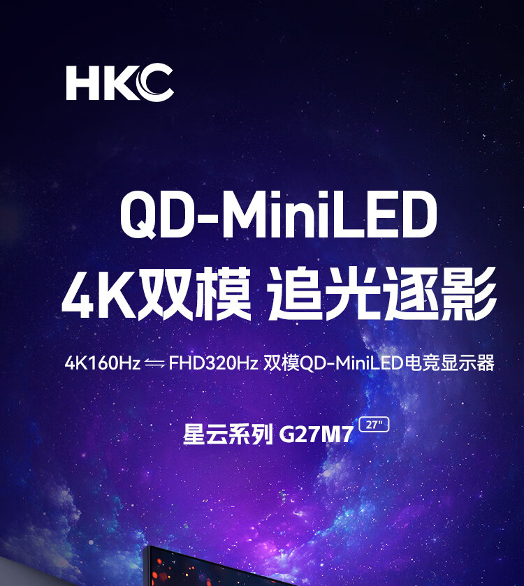 HKC 27英寸4K超清160Hz双模320Hz MiniLED背光QD量子点HDR1000旋转升降HDMI2.1游戏电竞显示器 G27M7