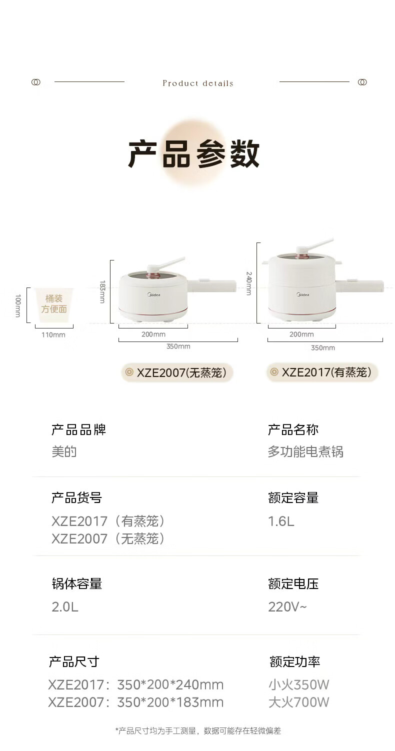 美的(Midea)电煮锅 小电锅 电蒸锅 长柄 宿舍小锅 多功能辅食锅 1.6L学生寝室一体泡面小火锅 XZE2017 配蒸笼