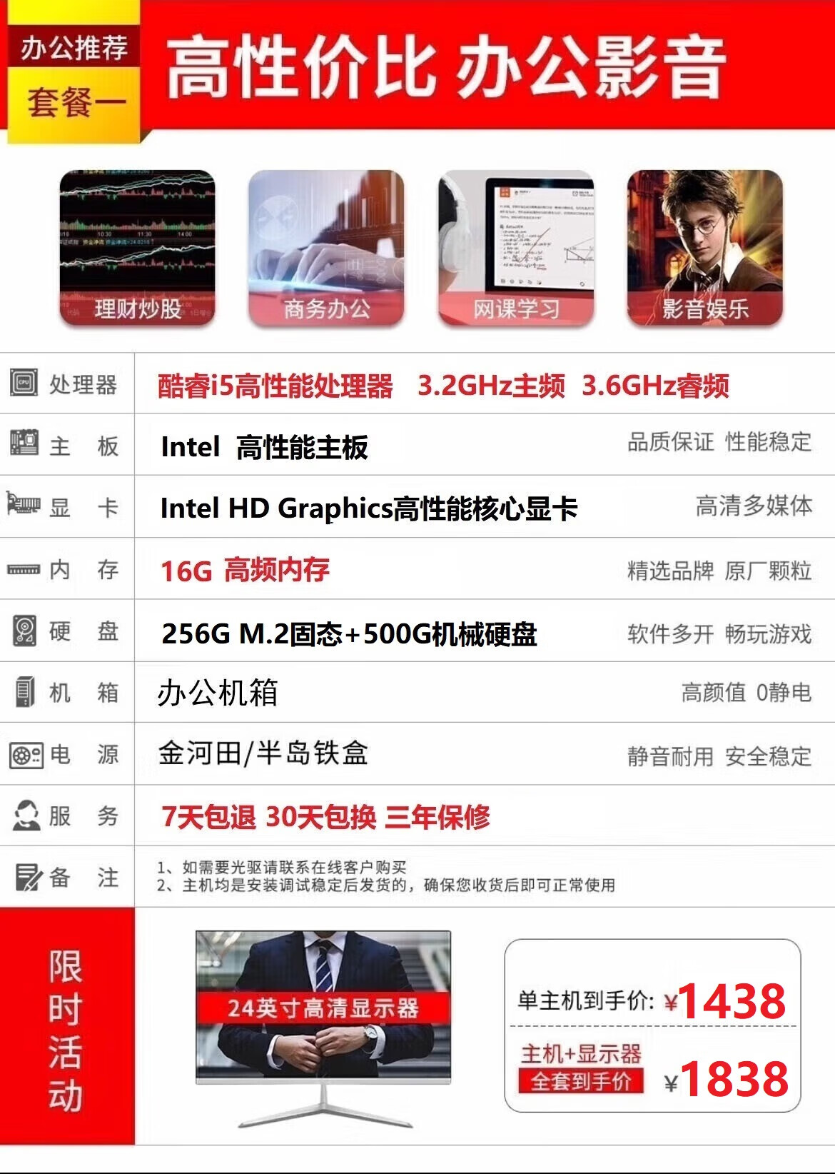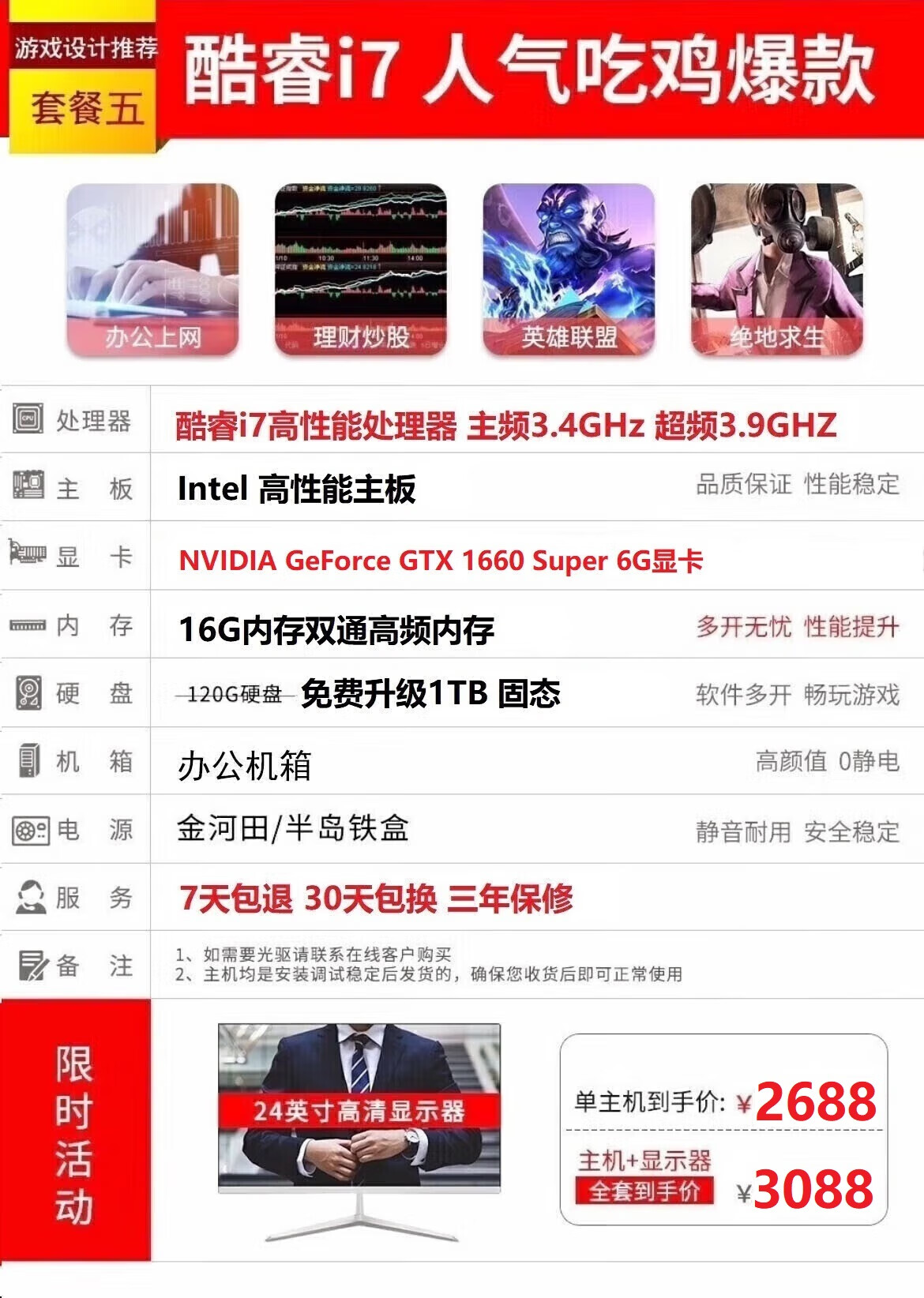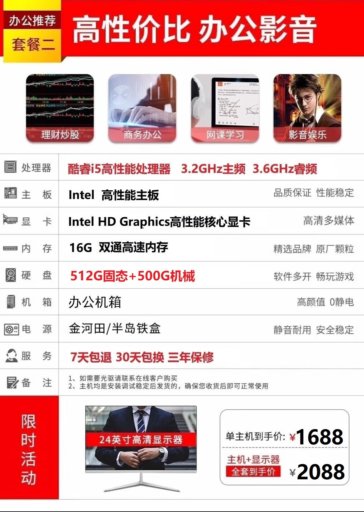 战翔 英特尔i5/i7台式电脑主机办公商用家用企业娱乐电商台式机全套游戏独显组装电脑设计整机 电脑主机 套餐一办公酷睿i5/16G/256G固态+500G