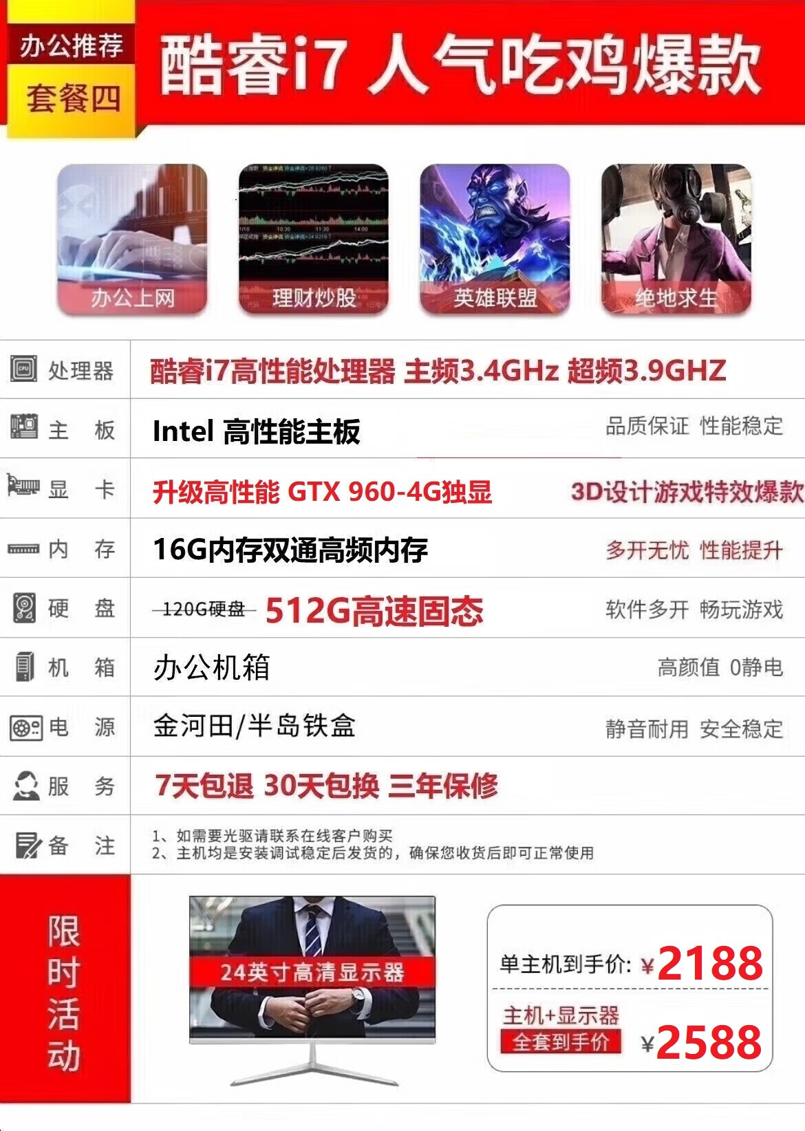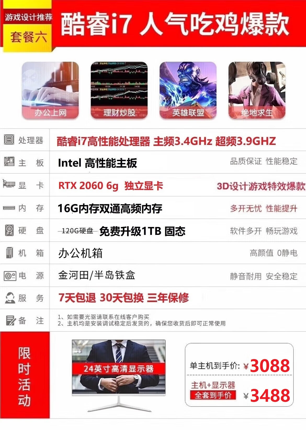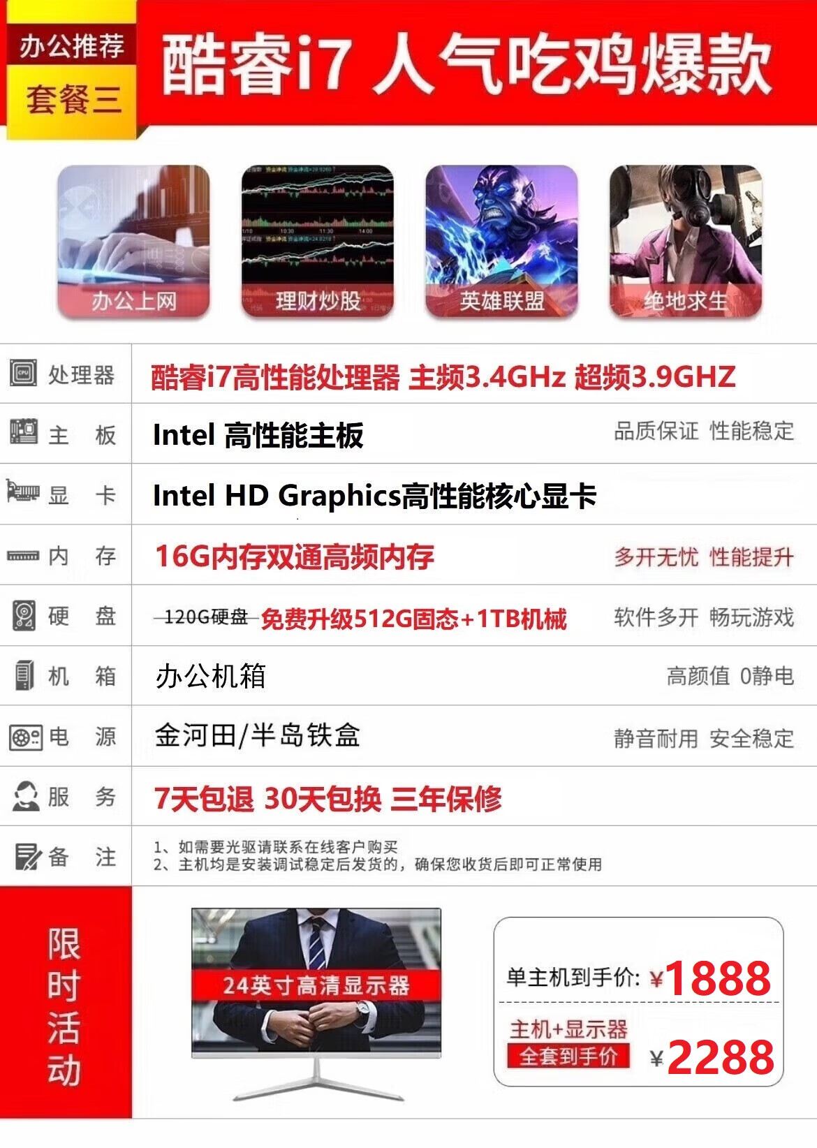 战翔 英特尔i5/i7台式电脑主机办公商用家用企业娱乐电商台式机全套游戏独显组装电脑设计整机 电脑主机 套餐一办公酷睿i5/16G/256G固态+500G
