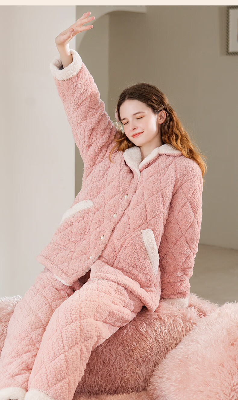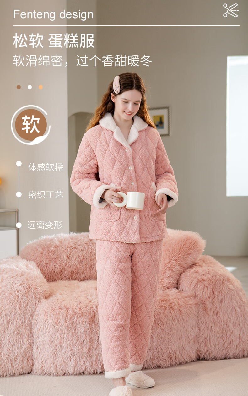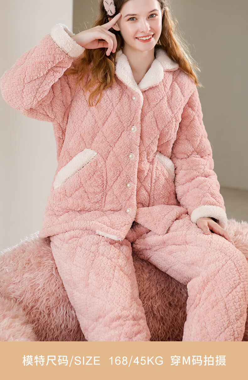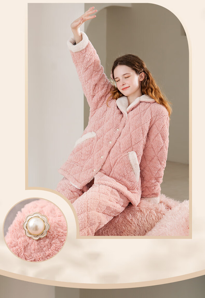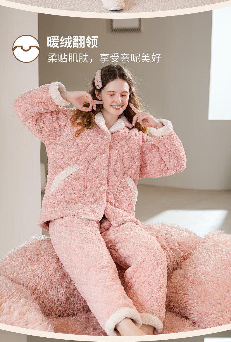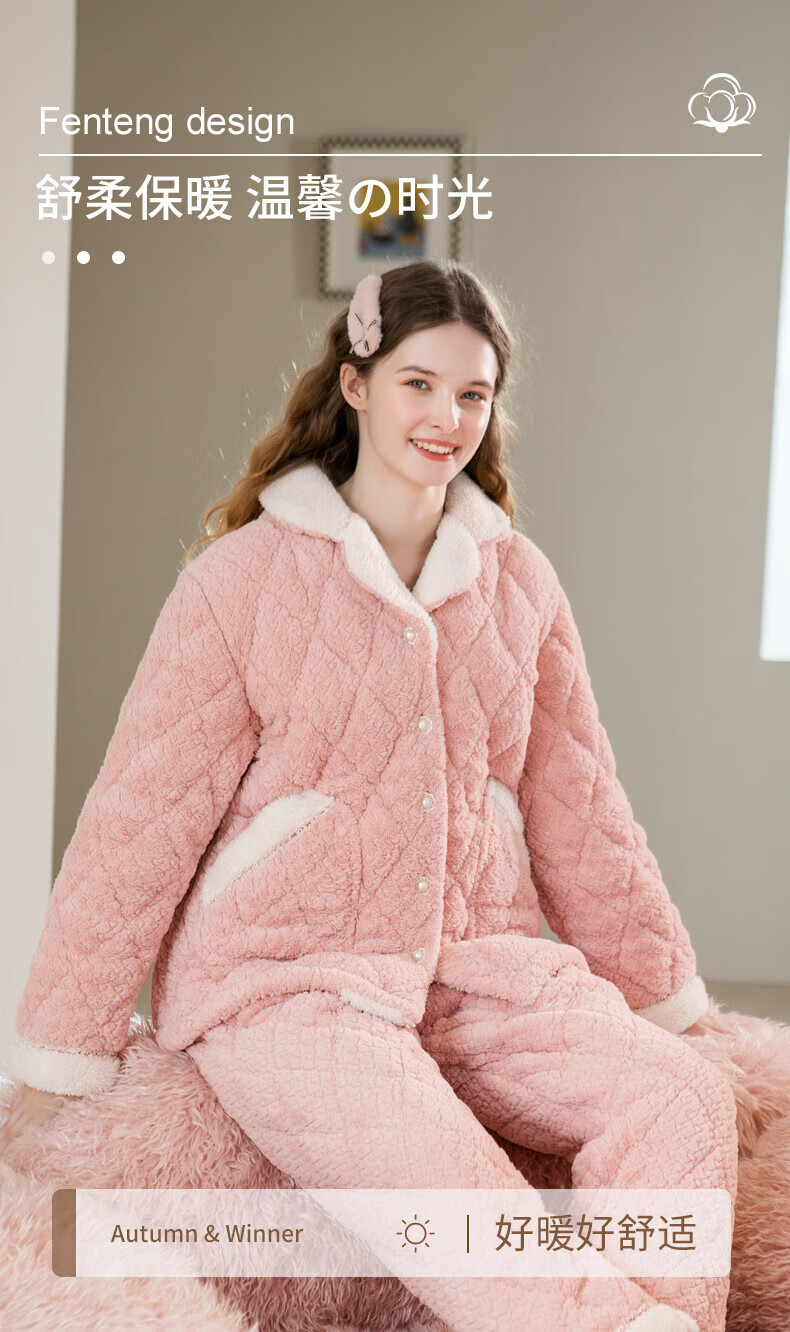 芬腾睡衣女冬季长袖新款三层夹棉加厚珊瑚绒翻领家居服套装 樱花粉 S