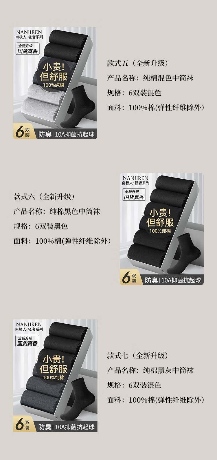 南极人男士袜子100%纯棉男袜6双抑菌无骨防臭休闲商务秋冬中筒袜