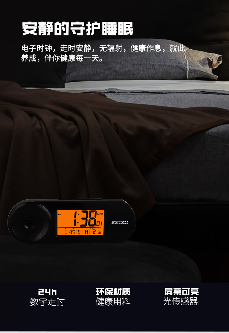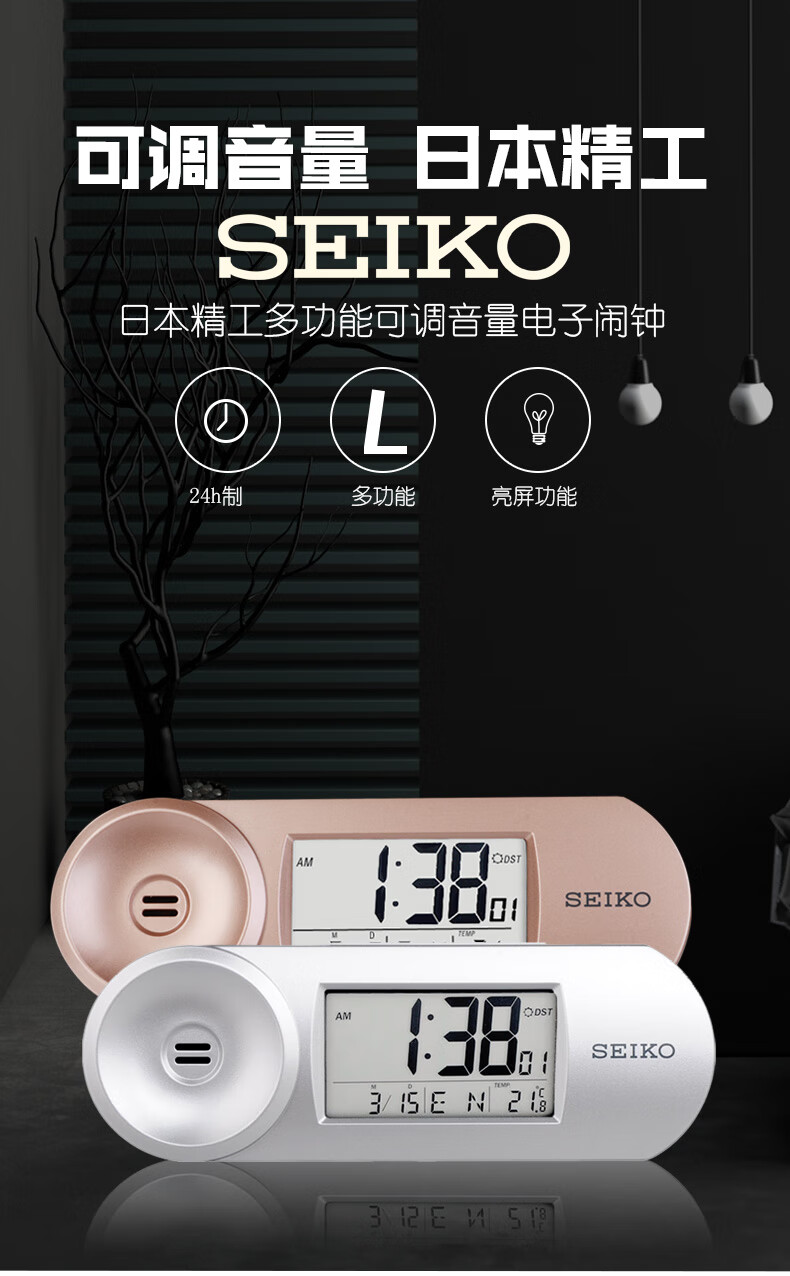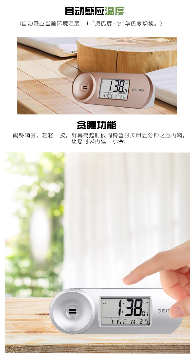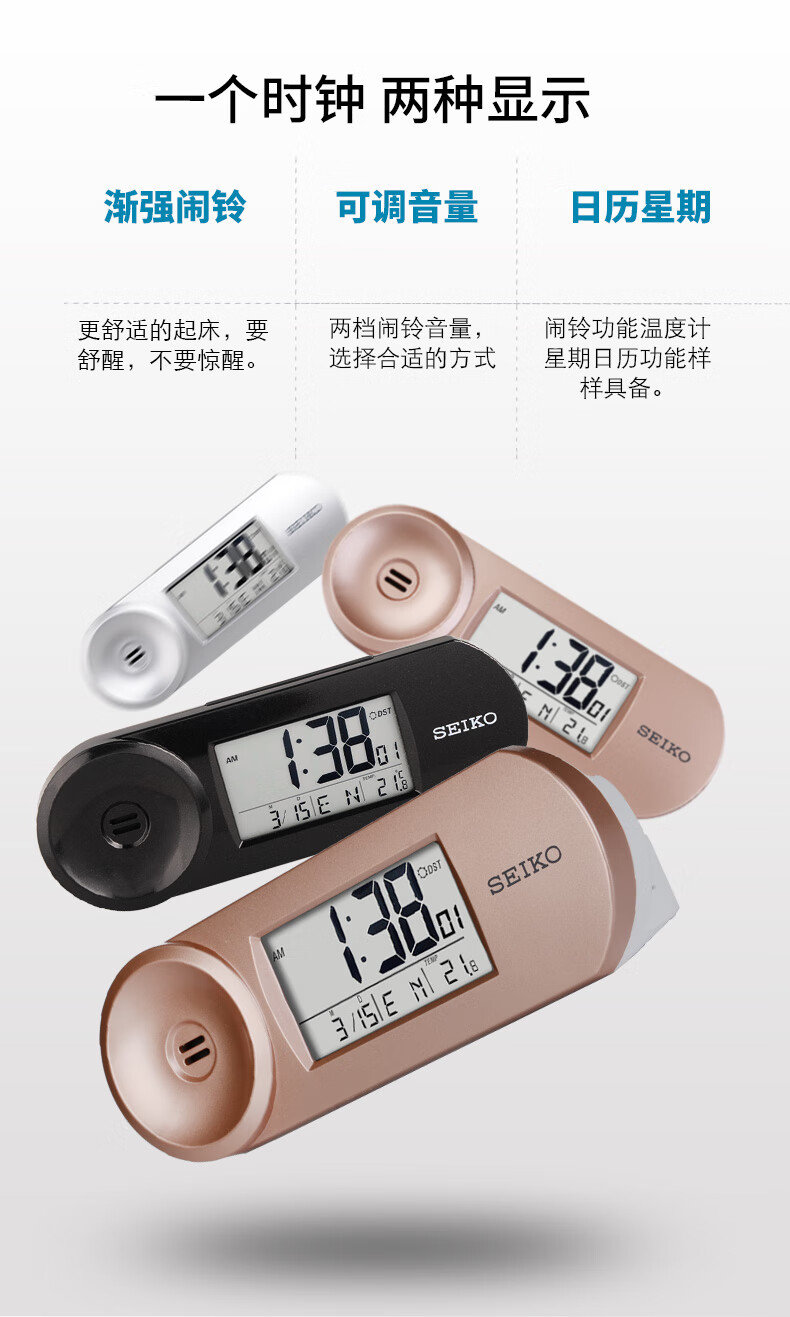 SEIKO日本精工时钟可调闹铃音量夜灯温度日历电子卧室办公室学生小闹钟