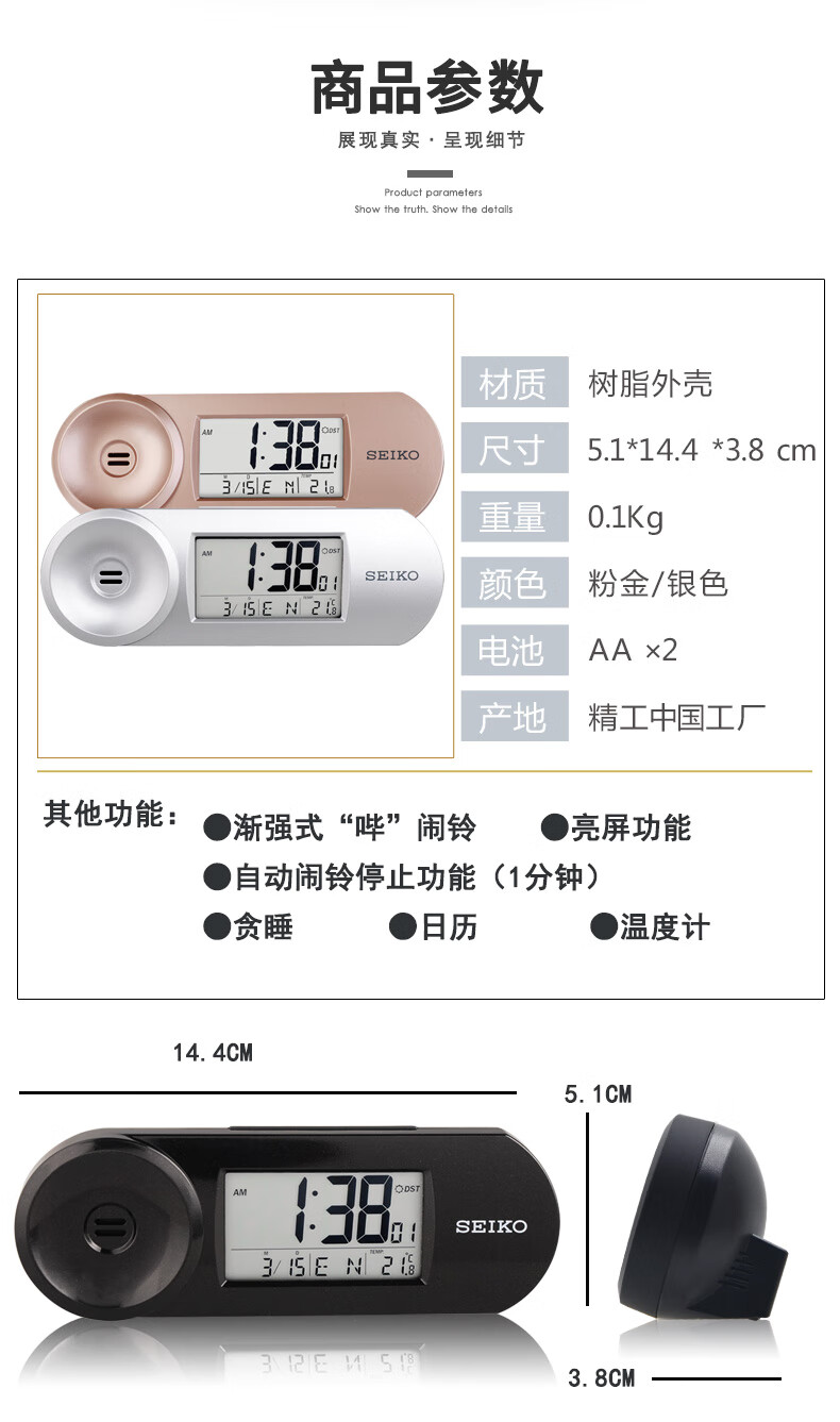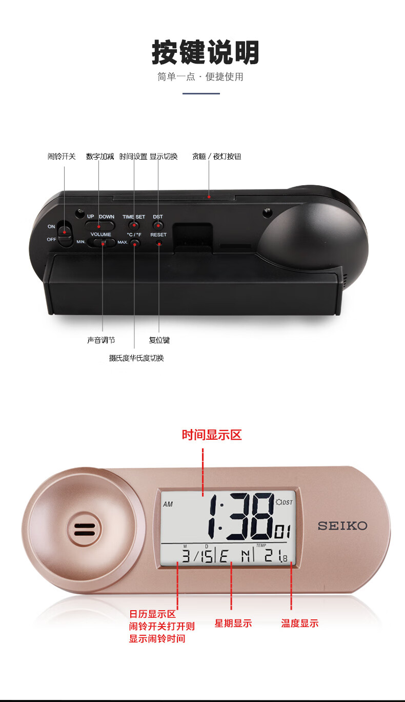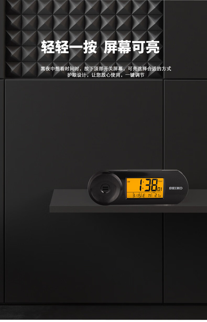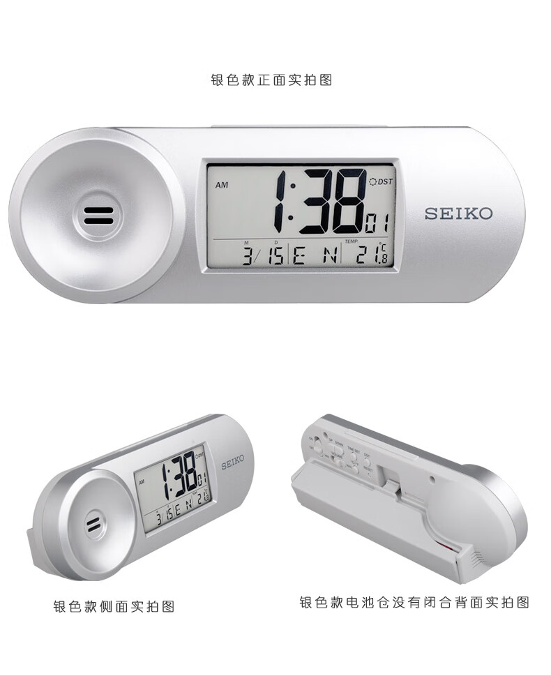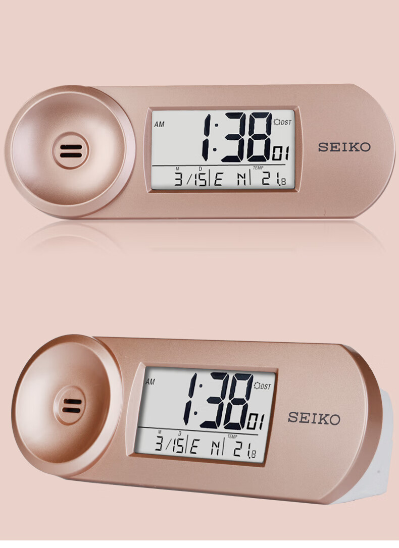 SEIKO日本精工时钟可调闹铃音量夜灯温度日历电子卧室办公室学生小闹钟