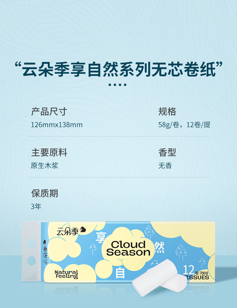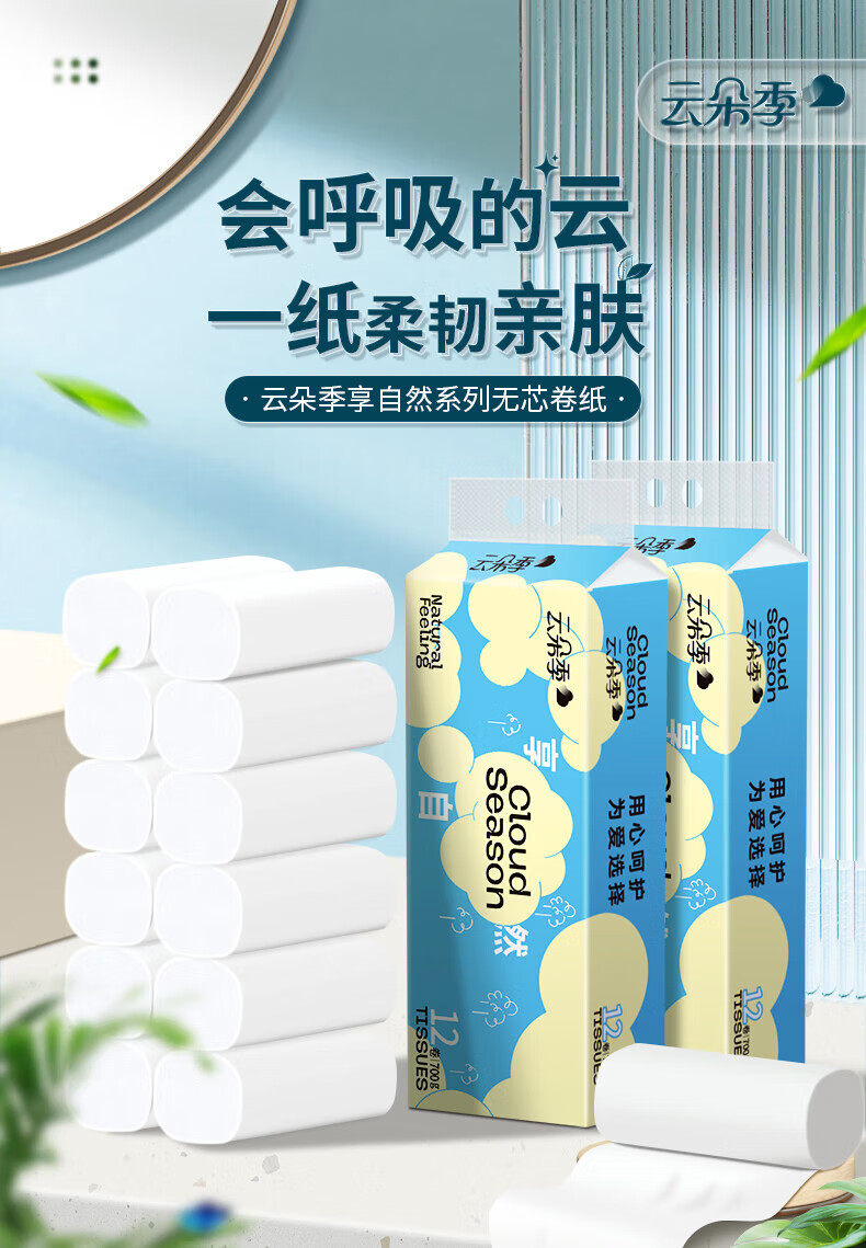 云朵季卷纸卫生纸家用实惠装纸巾5层加厚厕纸无芯卷筒纸手纸 5层 58g*48卷