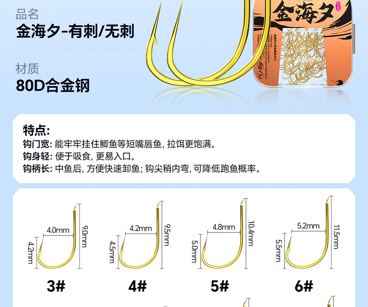 小凤仙金海夕鱼钩散装正品官方筏钓湖库翘嘴鳊鱼草鱼野钓100枚钓鱼钩 5# 金海夕&有刺(100枚盒装) 80D合金钢 散装鱼钩